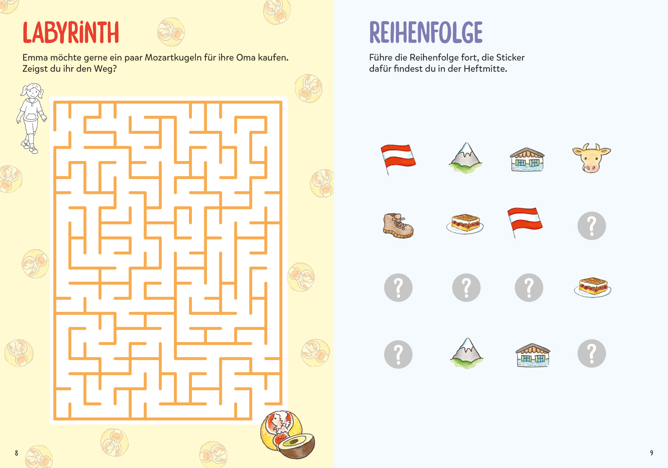 Wie heißt die Hauptstadt von Österreich? Was sagen die Österreicher zu Pfannkuchen und Schlagsahne? Und was ist eigentlich der Großglockner? Wer Österreich liebt wird große Freude an diesem Rätsel- und Malheft haben. Auf 32 Seiten warten Buchstaben- und Bilderrätsel, Sudoku und Kreuzwortgitter, Labyrinth und Geheimschrift auf ihre Lösung. Für zusätzlichen Spaß sorgen Motive wie Alpensteinböcke oder Berglandschaften zum Ausmalen sowie die vielen Sticker in der Mitte des Heftes zum Verschönern der Seiten.