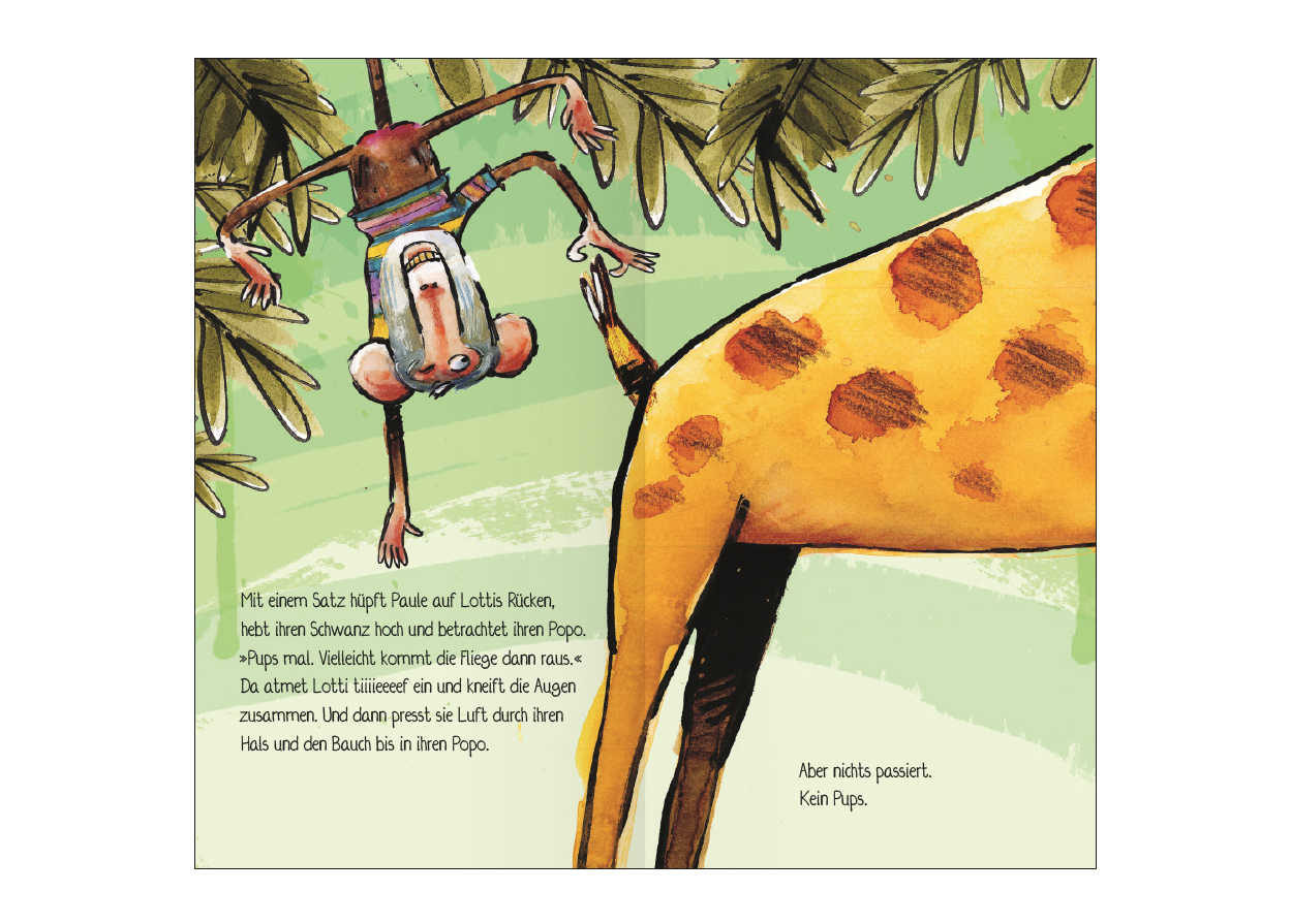 Oh Schreck, die Giraffe Lotti hat aus Versehen eine Fliege verschluckt. Die steckt jetzt in ihrem Bauch und Lotti muss bestimmt sterben. Davon ist sie fest überzeugt, denn Lotti macht gerne mal aus einer Mücke einen Elefanten. Wie gut, dass ihre Freunde ihr dabei helfen wollen, die fiese Fliege wieder nach draußen zu befördern. Am besten soll Lotti die Fliege einfach auspupsen. Doch das ist gar nicht so einfach! Erst nach einer Bauchmassage von Tintenfischfrau Medusa kann Lotti endlich pupsen - und, schwups, ist auch die Fliege wieder draußen aus Lottis Bauch. Was für eine Erleichterung!