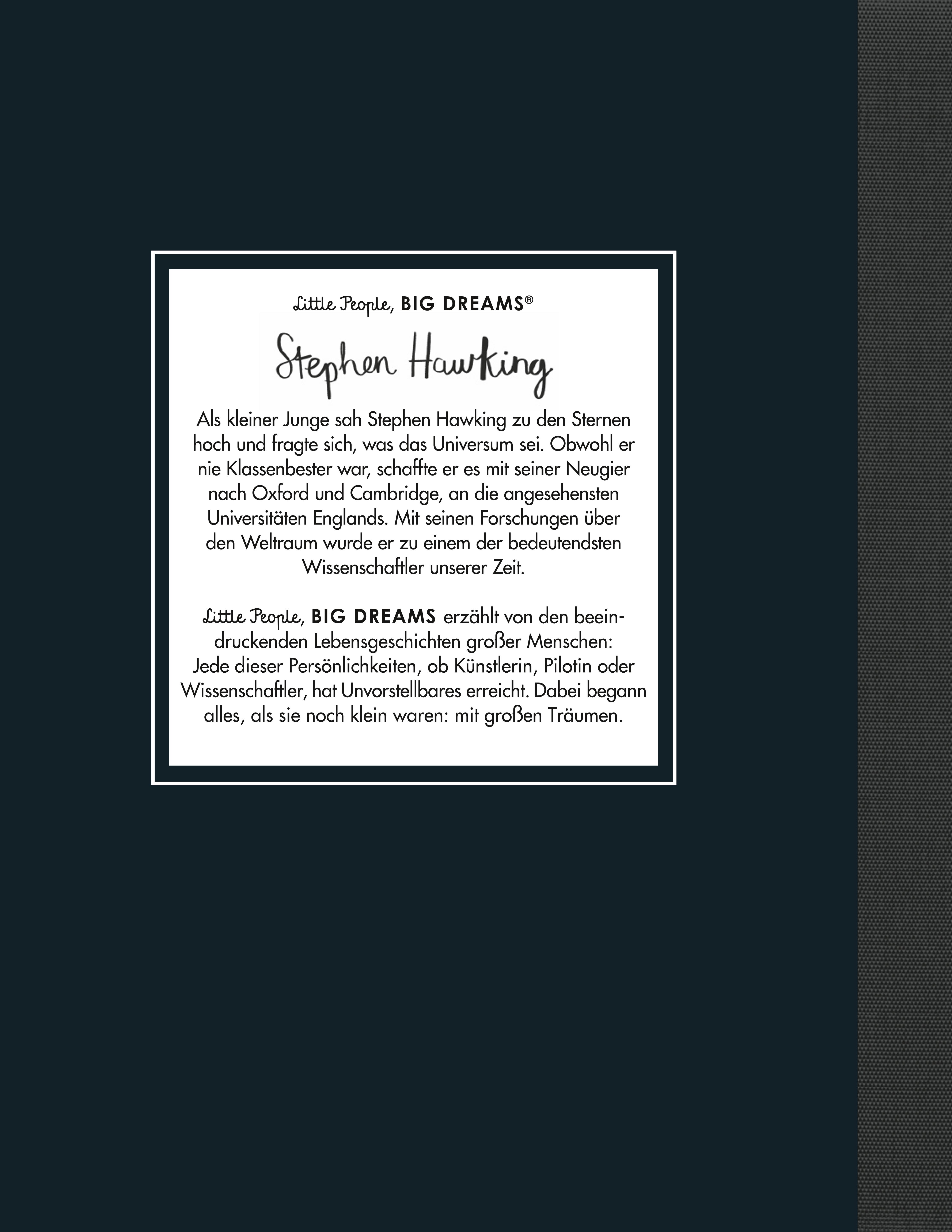 | Schlagworte | 50plus • ab 4 Jahre • ALS • Astrophysik • Berühmte Persönlichkeit • Beschäftigung für Kinder • Best Ager • Bilderbuch • buch-geschenk • Charakterstärke • Einschulung • Empowerment • Erster Schultag • Frühkindliche Bildung • Generation Gold • Geschenke für Jungs • Geschenke für Kinder • Geschenke für Mädchen • Golden Ager • Illustrationen • illustriert • Junge 4 Jahre • Kinderbuch • Kinderbuch ab 4 Jahre • Kinderbücher • kurze Antworten auf grosse Fragen • kurze Geschichte der Zeit • Little People Big Dreams • Mädchen 4 Jahre • mit Illustrationen • Ostergeschenke Kinder • Ostern Kinder • Pequeño y grande: Stephen Hawking deutsch • Physiker • Porträt • Relativitätstheorie • Rentner • Rentnerdasein • Ruhestand • Schulanfang • Schulanfänger • Schulbeginn • Schultüte • Senioren • Stephen Hawking • Träume verwirklichen • Vorbild • Vorlesen • Willenskraft • Zuckertüte |
