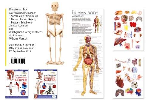 Eine Abenteuerreise durch den Körper und die Welt der Sinne: Diese Mitmachbox lädt Kinder zum aktiven Erleben ein. Im detailreich illustrierten Buch gibt es faszinierende Fakten zu Aufbau und Funktionsweise, von den Zellen bis zur Ersten Hilfe. Das Riesenposter liefert atemberaubende Innenansichten. Sticker, Skelettbausatz und Malschablone sind lehrreiches Infotainment für junge Leser.
