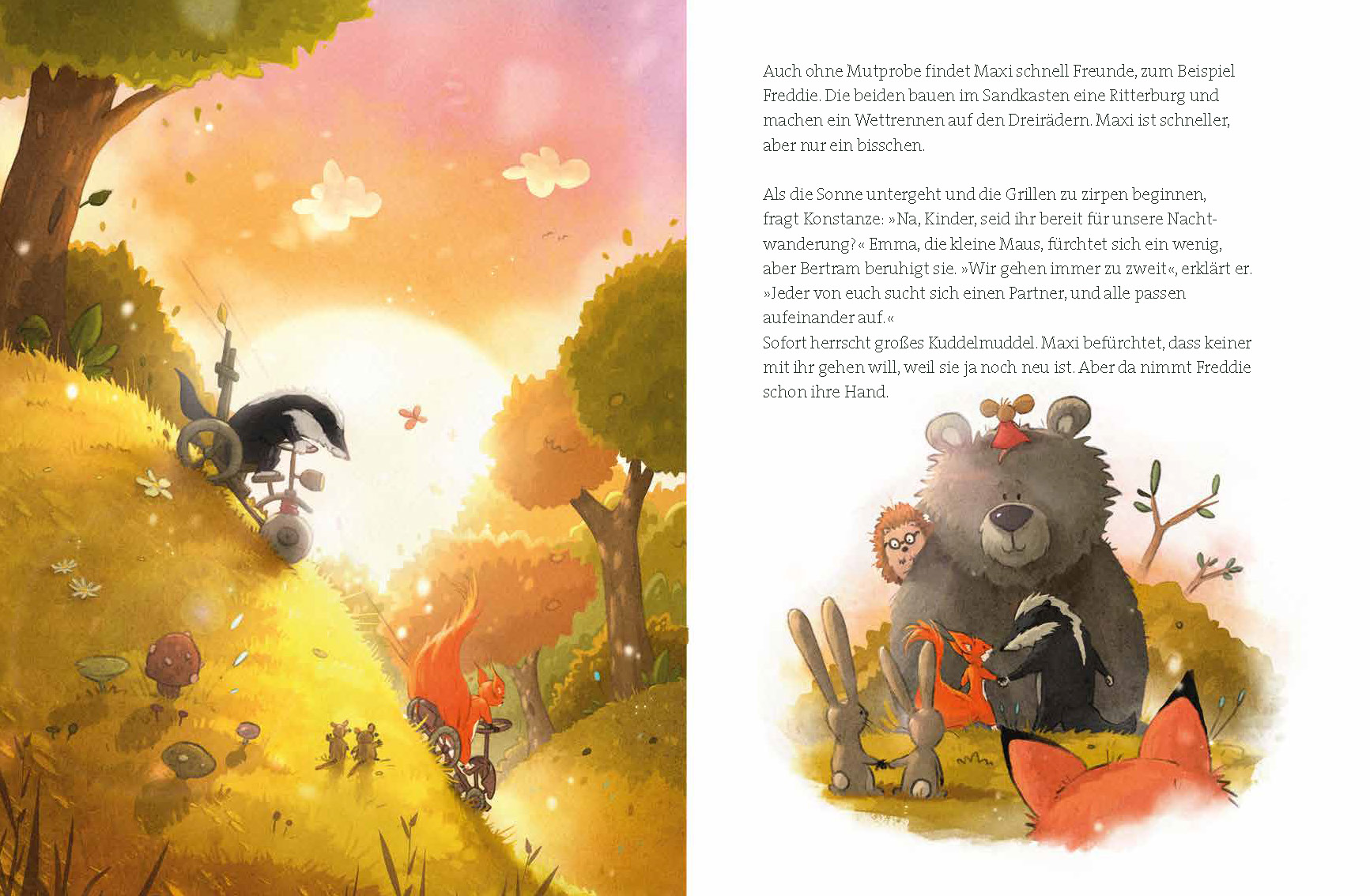 Eichhörnchen Maxi hat ihren ersten Tag im Waldkindergarten. Klar, dass das ganz schön aufregend ist! So aufregend, dass sogar die Eichhörnchen-Mama nervös ist. Sie hat ihre Tochter doch noch nie so lange allein gelassen und ermahnt sie beim Abschied, unbedingt gut auf sich aufzupassen. Maxi hat andere Sorgen: Ob sie hier wohl schnell neue Freunde findet? Sie nimmt sich vor, stark und selbstbewusst zu sein, um die anderen Tierkinder zu beeindrucken. Aber der Kastanienbaum ist ganz schön hoch und der Wald furchtbar dunkel. Bald lernt Maxi, dass Starksein auch bedeutet, dass man sich Hilfe holen und auch mal Nein sagen darf. Deswegen ist man noch lange kein Angsthörnchen! Tanja Mairhofer, bekannt aus dem Fernsehen, hat ein zauberhaftes Bilderbuch für Kinder und ihre Eltern geschrieben. Mit dieser charmanten Tiergeschichte möchte sie das Selbstbewusstsein von Kindern stärken und sie ermutigen, Grenzen zu setzen. Gleichzeitig müssen auch die Eltern lernen, Schritt für Schritt ein wenig loszulassen.