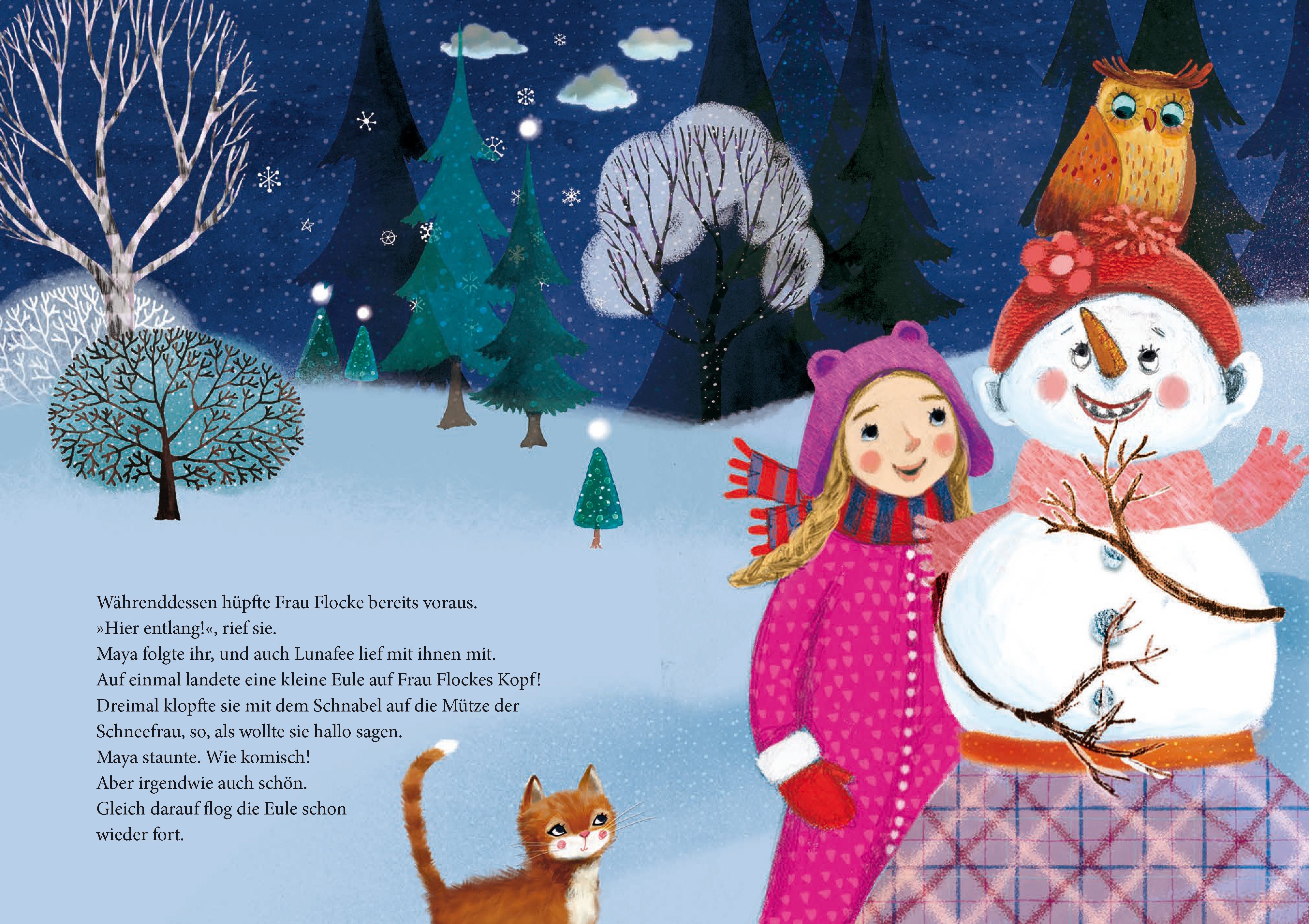 Als Maya in diesem Winter eine Schneefrau baut, ist alles ein bisschen anders als sonst: Vögel folgen ihr zwitschernd, ein Eichhörnchen trägt einen Ast herbei, und dann zwinkert ihr die Schneefrau auch noch zu! Doch dies ist erst der Beginn eines magischen, schneefunkelnden Winterabenteuers ...
