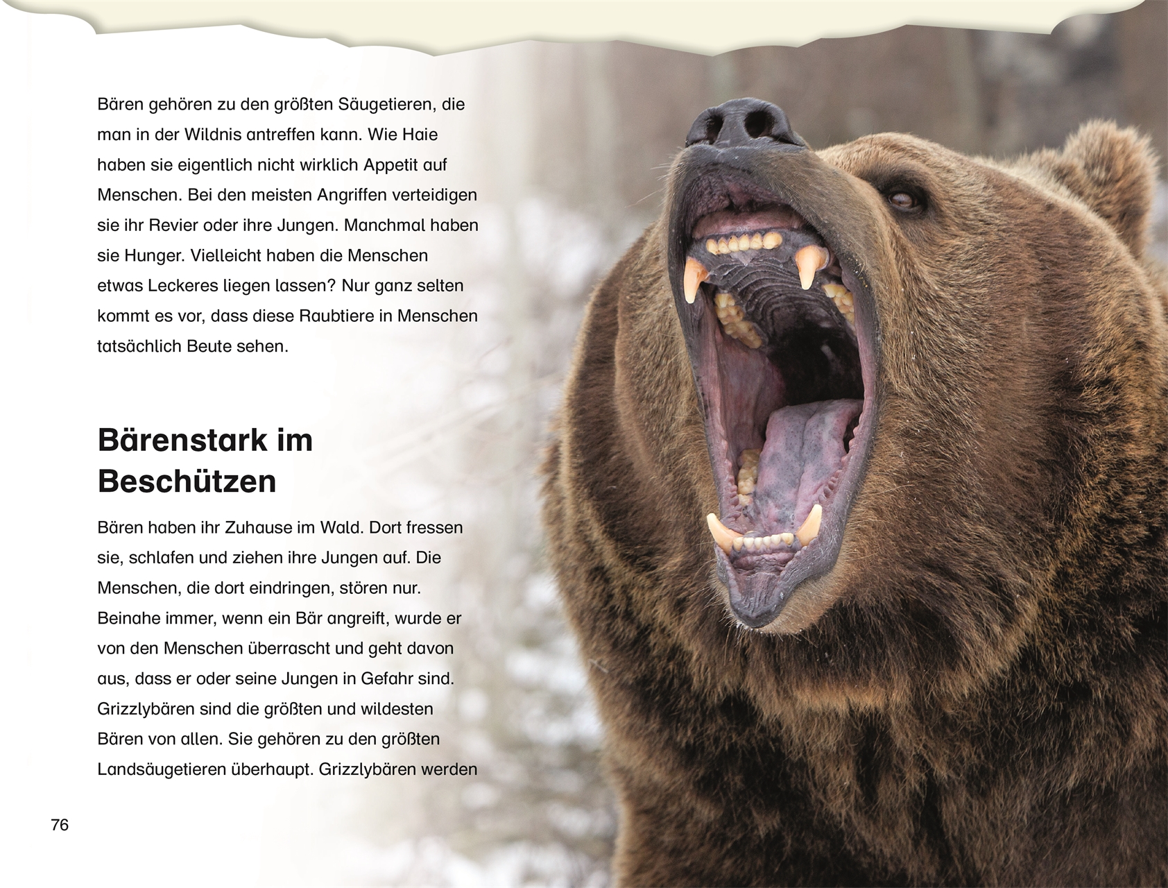 Da stockt der Atem! Denn zwischen diesen Buchseiten lauern kleine bissige Ameisen, stechende Hornissen, giftige Frösche, brüllende Löwen und der riesige Weiße Hai. Mutige Leseanfänger erfahren nicht nur, warum diese Tiere so gefährlich für uns Menschen sind, sondern auch, wie wir uns am besten vor ihnen schützen. Das Buch zeigt auch, dass die meisten dieser Tierarten den Mensch gar nicht als Feind betrachten, sondern lediglich ihre Jungen verteidigen und nicht gestört werden wollen.