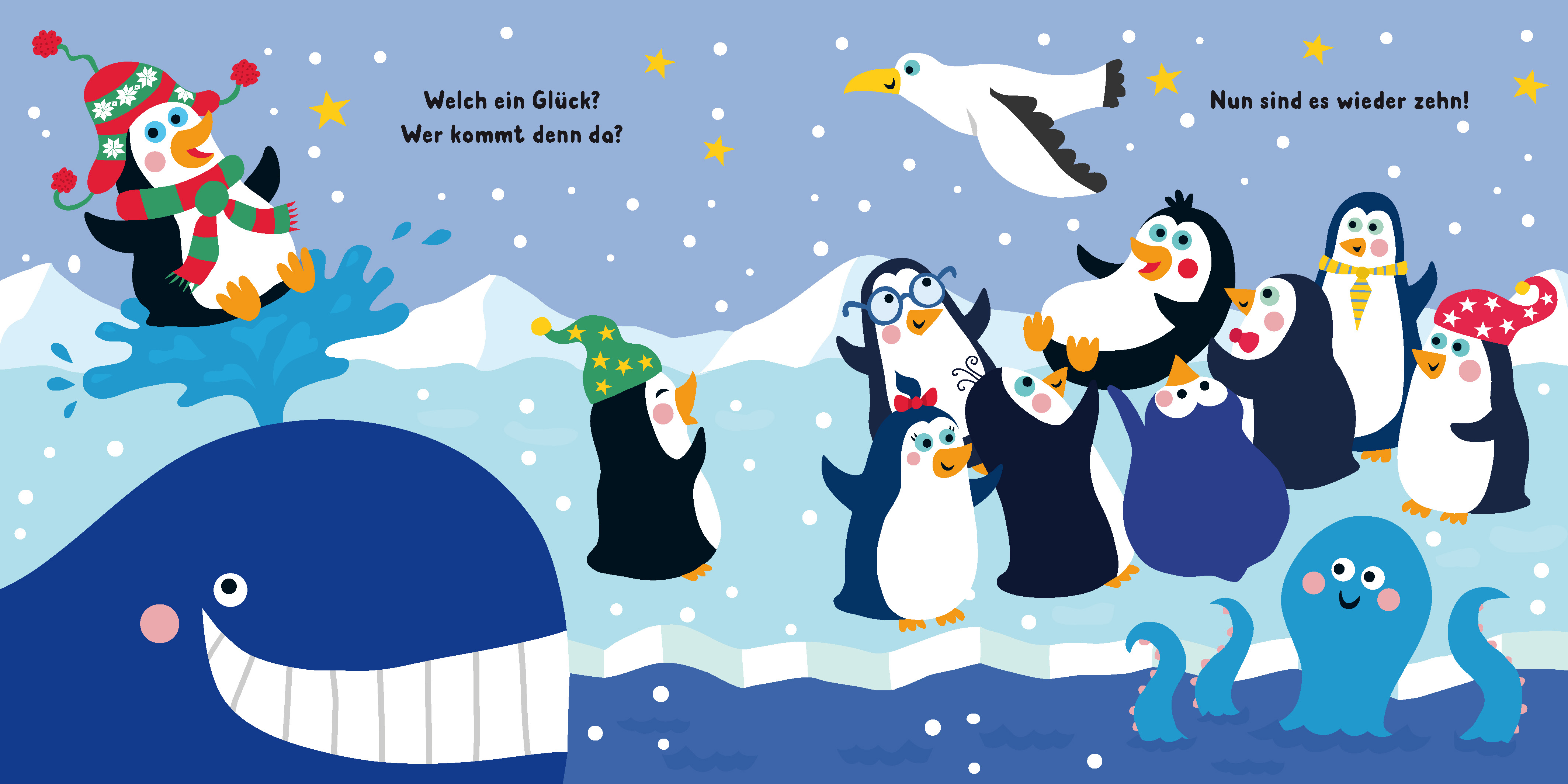 10 freche Pinguine ganz viel Spaß und stellen in Schnee und Eis einiges an. Dabei geht immer mal ein kleiner Pinguin verloren. Ob beim Drehwurm-Schlittschuhfahren, Eisbergeschlittern oder beim Fischeis-Wettessen. Am Ende bleibt ein kleiner Pinguin übrig. Doch er ist nicht lange allein: Schwuppdiwupp - sind alle wieder da!