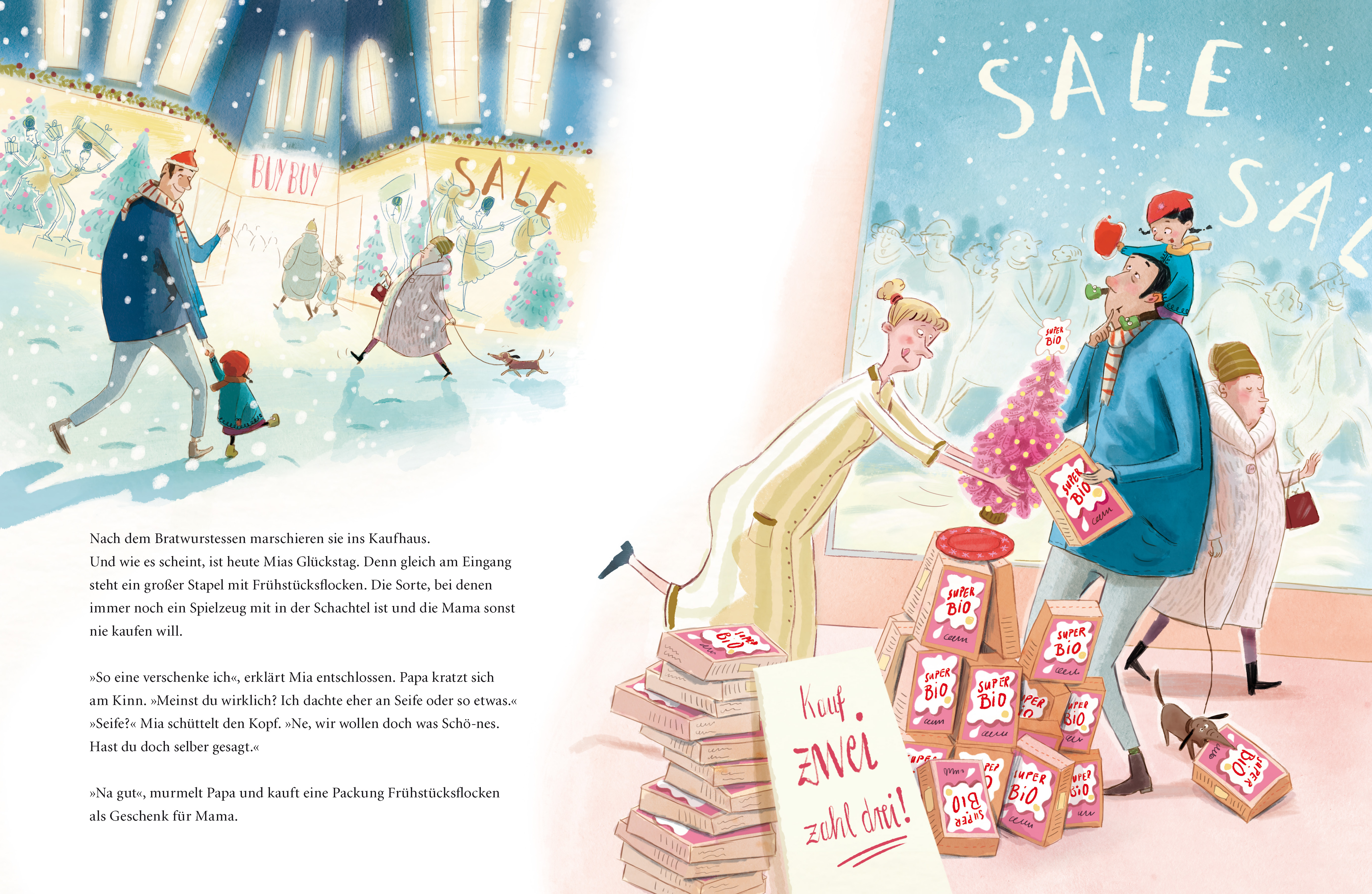 Es ist der Tag vor Heiligabend und Mia will mit Papa zusammen noch ein Last- Minute-Weihnachtsgeschenk für Mama kaufen. Gar nicht so einfach! Im Kaufhaus herrscht dichtes Gedränge. Endlich haben sie etwas Tolles gefunden. Jetzt schnell nach Hause. Aber wo ist Papa? Wie soll Mia ihn in diesem Durcheinander wiederfinden? Doch bevor die Tränen kullern, taucht ein rettender Engel auf und Papa und Mia fallen sich glücklich in die Arme. Aber wo sind all die schönen Geschenke geblieben?