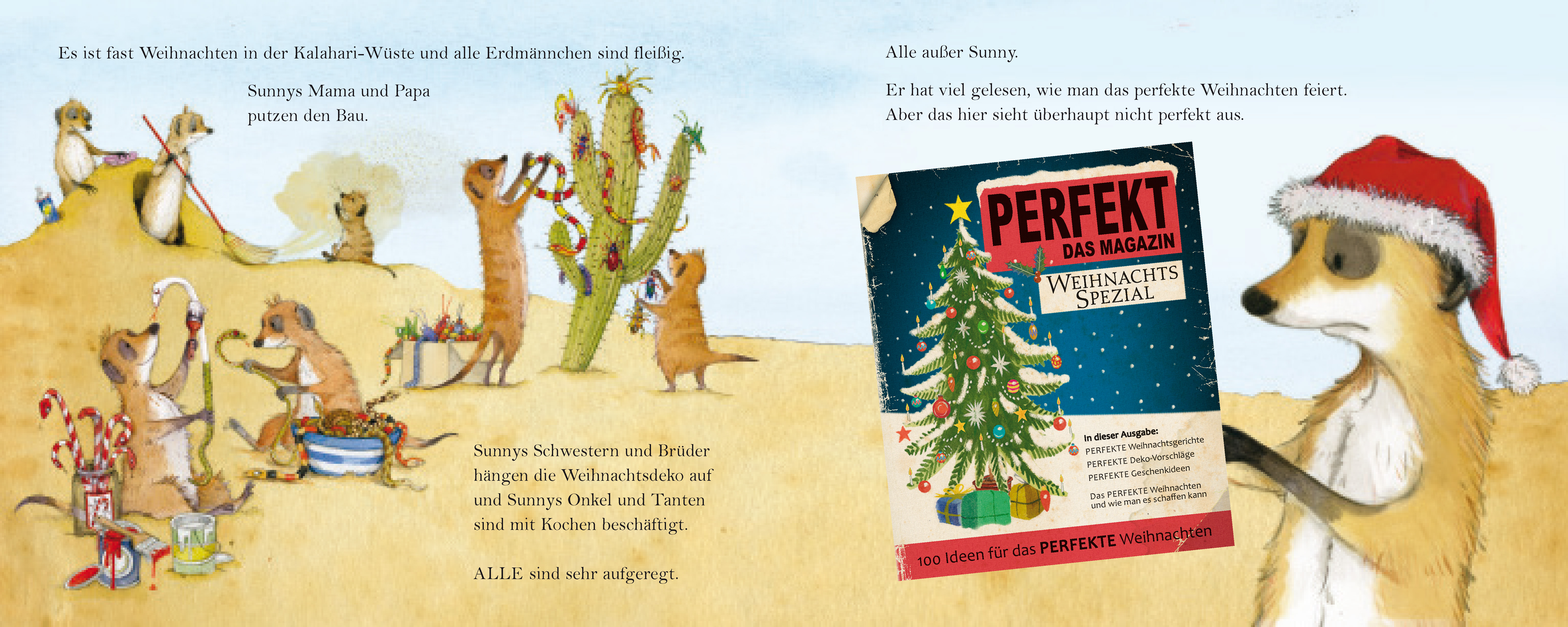 Die Weihnachtsvorbereitungen in der Kalahari-Wüste laufen auf Hochtouren. Aber perfekte Weihnachten sehen anders aus, findet Erdmännchen Sunny. Nämlich so, wie in dem glitzerglänzenden Weihnachtsmagazin, das er gelesen hat. Also macht er sich auf die Reise zu seinen Freunden. Vielleicht geht es dort etwas weihnachtlicher zu? Aber entweder fehlt der Glitzer oder der Schnee ist viel zu kalt oder es gibt ausgerechnet Rosenkohl als Weihnachtsessen. Sunny ist nicht überzeugt. Die Weihnachtspost, die Sunny an seine Familie schreibt, klingt jedenfalls nicht so, als würde Sunny Spaß haben. Und überhaupt fehlt ihm seine Familie mit einem Mal ganz schrecklich. Wie gut, dass der Weihnachtsmann eine glänzende Idee hat ...