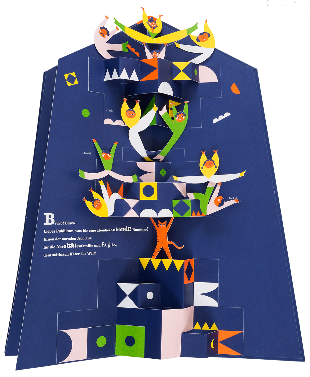Eins, zwei, drei, die Akrobaten ist ein kunstvoll gefertigtes Pop‐up‐Buch, das Kindern hilfreiche Zähltechniken vorstellt und zeigt, wie viel Spaß es macht, im Team zu arbeiten.