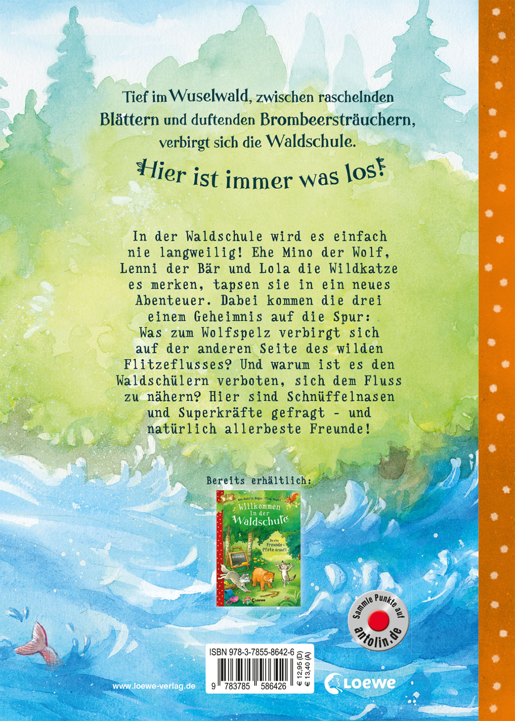 In der Waldschule wird es einfach nie langweilig! Ehe Mino der Wolf, Lenni der Bär und Lola die Wildkatze sich versehen, tapsen sie in ein neues Abenteuer. Dabei kommen die drei einem Geheimnis auf die Spur: Was zum Wolfspelz verbirgt sich auf der anderen Seite des wilden Flitzeflusses? Und warum ist es den Waldschülern verboten, sich dem Fluss zu nähern? Hier sind Schnüffelnasen und Superkräfte gefragt - und natürlich allerbeste Freunde!