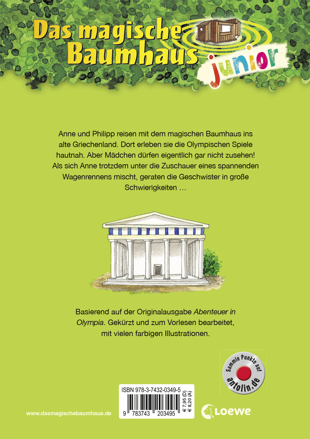 In Tunika und Sandalen landen Anne und Philipp mithilfe des magischen Baumhauses mitten in einem Olivenbaum im alten Griechenland – und das während der Olympischen Spiele! Inmitten des Trubels muss Anne bald feststellen, dass dort für Mädchen beinahe alles verboten ist. Als sie sich über eine der Regeln hinwegsetzt und sich bei den Spielen einschleicht, geraten Anne und Philipp in große Schwierigkeiten …