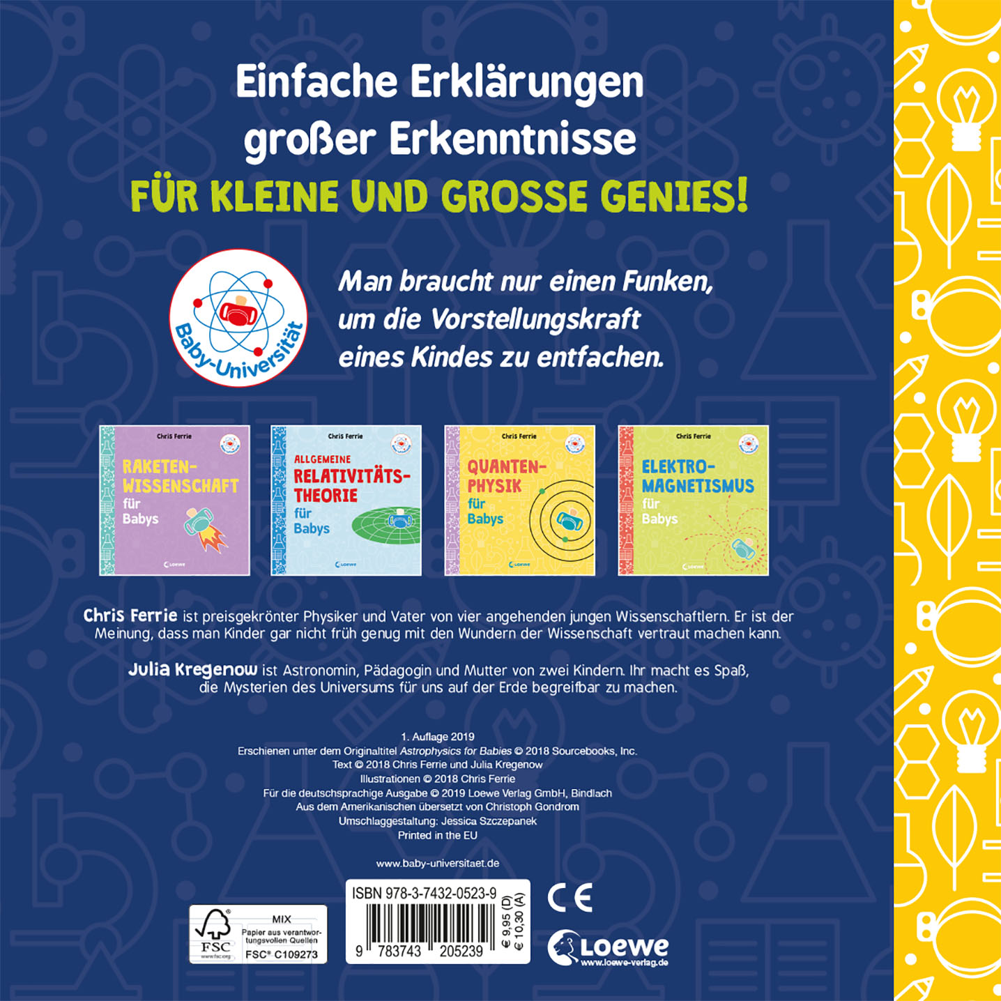 Astrophysik für Babys erklärt auf heitere und verständliche Weise, wie Physik und Chemie Himmelskörper im Weltraum beeinflussen. Kleinkinder (und Erwachsene!) lernen, warum sie Teil unseres Universums sind. Mit unnachahmlicher Leichtigkeit und stets mit einem Augenzwinkern schaffen es der Physiker Chris Ferrie und die Astronomin Julia Kregenow, Kinder und Erwachsene gleichermaßen zu inspirieren. Die Bücher der Baby-Universität sind der einfachste Weg, um schon unsere Jüngsten für die Wunder der Wissenschaft zu begeistern.