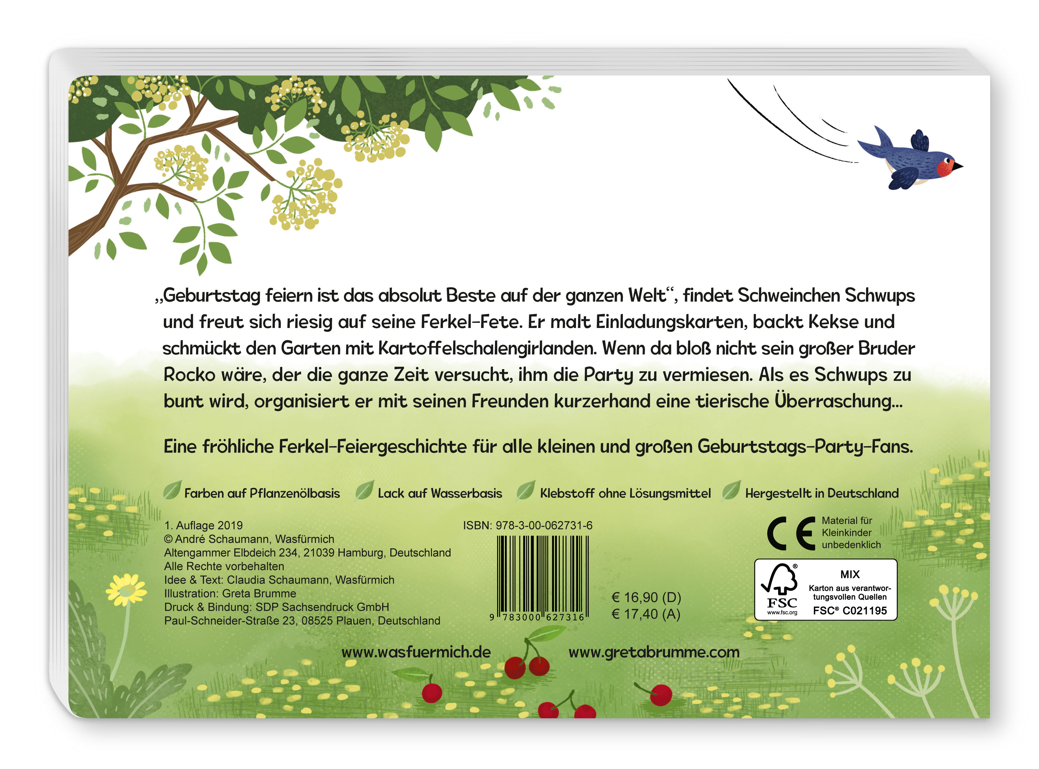 "Geburtstag feiern ist das absolut Beste auf der ganzen Welt", findet Schweinchen Schwups und freut sich riesig auf seine Ferkel-Fete. Er malt Einladungskarten, backt Kekse und schmückt den Garten mit Kartoffelschalengirlanden. Wenn da bloß nicht sein großer Bruder Rocko wäre, der die ganze Zeit versucht, ihm die Party zu vermiesen. Als es Schwups zu bunt wird, organisiert er mit seinen Freunden kurzerhand eine tierische Überraschung...