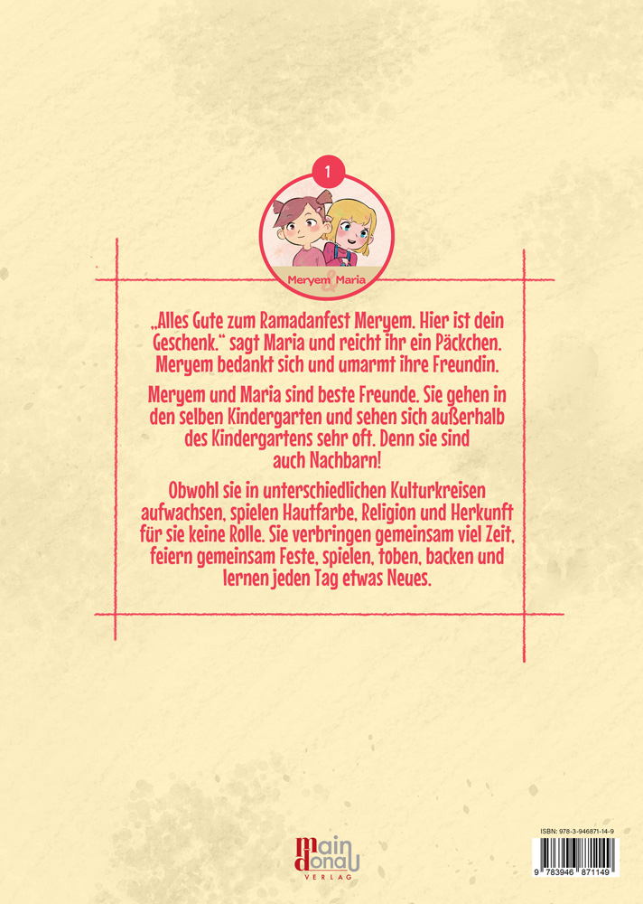 Alles Gute zum Ramadanfest, Meryem. Hier ist dein Geschenk", sagt Maria und reicht ihr ein Päckchen. Meryem bedankt sich und umarmt ihre Freundin.Meryem und Maria sind beste Freunde. Sie gehen in denselben Kindergarten und sehen sich außerhalb des Kindergartens sehr oft. Denn sie sind auch Nachbarn!Obwohl sie in unterschiedlichen Kulturkreisen aufwachsen, spielen Hautfarbe, Religion und Herkunft für sie keine Rolle. Sie verbringen gemeinsam viel Zeit, feiern gemeinsam Feste, spielen, toben, backen und lernen jeden Tag etwas Neues.