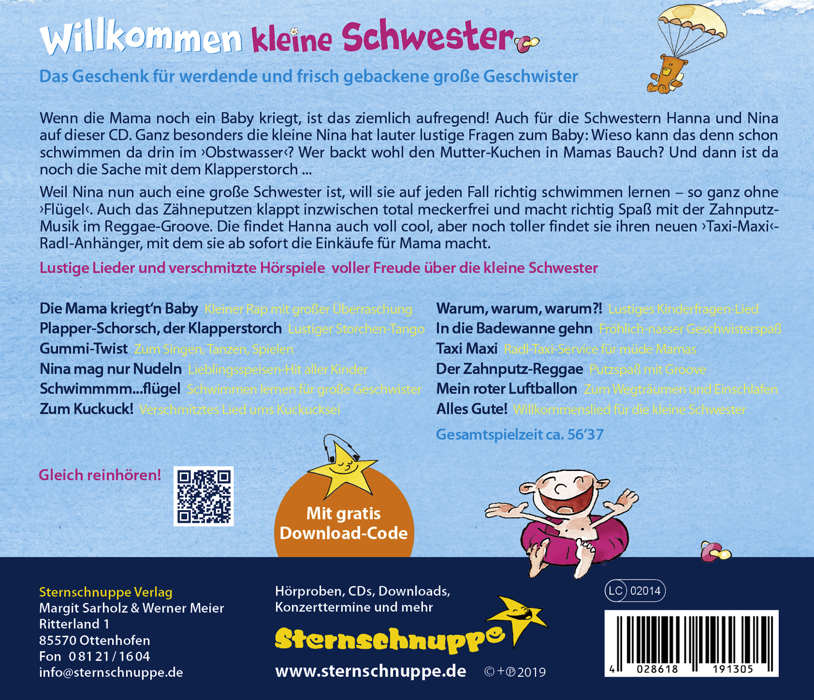 Wenn die Mama noch ein Baby kriegt, ist das ziemlich aufregend! Auch für die Schwestern Hanna und Nina auf dieser CD. Ganz besonders die kleine Nina hat lauter lustige Fragen zum Baby: Wieso kann das denn schon schwimmen da drin im 'Obstwasser'? Wer backt wohl den Mutter-Kuchen in Mamas Bauch? Und dann ist da noch die Sache mit dem Klapperstorch... Weil Nina nun auch eine große Schwester ist, will sie auf jeden Fall richtig schwimmen lernen - so ganz ohne 'Flügel'. Auch das Zähneputzen klappt inzwischen total meckerfrei und macht richtig Spaß mit der Zahnputz-Musik im Reggae-Groove. Die findet Hanna auch voll cool, aber noch toller findet sie ihren neuen 'Taxi-Maxi'-Radl-Anhänger, mit dem sie ab sofort die Einkäufe für Mama macht.