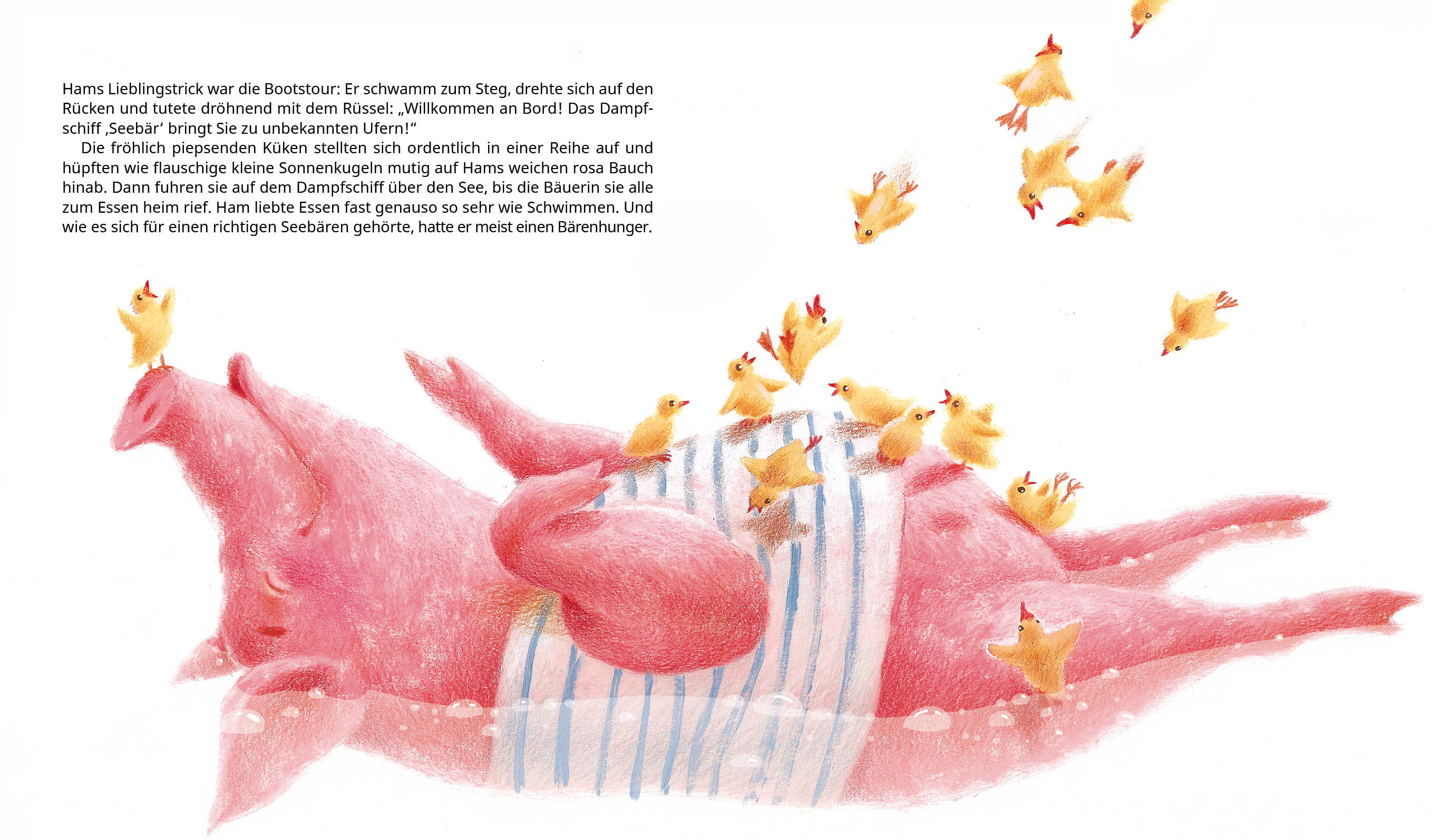 Der Bauernhof lag zwar nicht am Meer, aber immerhin an einem See. Der war so groß und tief, dass man ihn glatt für ein Meer halten konnte. Vor allem, wenn man ein ganz normales Schweinchen war und wohl nie das echte Meer sehen würde. Das Rote und das Schwarze Meer, das tiefblaue Mittelmeer und sogar das eiskalte Polarmeer – sie alle waren unerreichbar, genau wie die wogenden Wel- len und Schaumkronen, die Delfine, Haie und Piraten, die haushohen Kreuzfahrt- schiffe und die kreischenden Möwen. Am See quakten bloß Enten, aber das Schweinchen stellte sich vor, es seien Mö- wen. Wäre es nicht auf einem Bauernhof geboren worden, sondern in einem kleinen Fischerdorf, dann hätte es sicher Kapitän werden können. Es wäre am Steuer seines Schiffes um die Welt gesegelt und hätte nach unerforschten Ländern und Inseln mit Piratenschätzen gesucht. Doch so blieben ihm nur der See, seine Freunde und unerfüllbare Träume vom großen, weiten Meer. Vom Meer hatte ihm eine Wildgans erzählt. Im letzten Sommer hatten die Bau- ersleute sie mit einem verletzten Flügel im Wald gefunden. Sie nahmen sie bei sich auf, nannten sie Grey und pflegten sie gesund, damit sie im nächsten Herbst gemeinsam mit ihrem Schwarm in den Süden fliegen konnte. An den langen Win- terabenden erzählte Grey den anderen Tieren von Walen, Haien und tollkühnen Kapitänen. Unglaublich, was man beim Flug über den Ozean alles zu sehen bekam! Die Hühner, Schweine, der alte Hund und die Kuh hörten Greys Seemanns- garn nur mit halbem Ohr zu, aber die Küken, der Hundewelpe Ciao und das Schweinchen wurden vom Meeresfieber angesteckt. Am wissbegierigsten war das kleine Schweinchen. Es löcherte die Wild- gans mit Fragen, die sie geduldig beantwortete. Und obwohl es eigentlich Ham hieß, wollte das Schweinchen ab jetzt lieber Seebär genannt werden. Irgendwann ging der Winter vorbei. Nach ihm kam ein herrlicher Früh- ling und dann ein zauberhafter Sommer. Der wilde Grey war wieder kräftig genug, um sich auf die Suche nach seinem Schwarm zu machen. Es tat im sogar ein Bisschen leid, denn er hatte das neugierige Schweinchen ins Herz geschlossen. Doch Ham blieb auf dem Bauernhof zurück und in seiner Fantasie erlebte er auf dem See die aufregendsten Abenteuer.