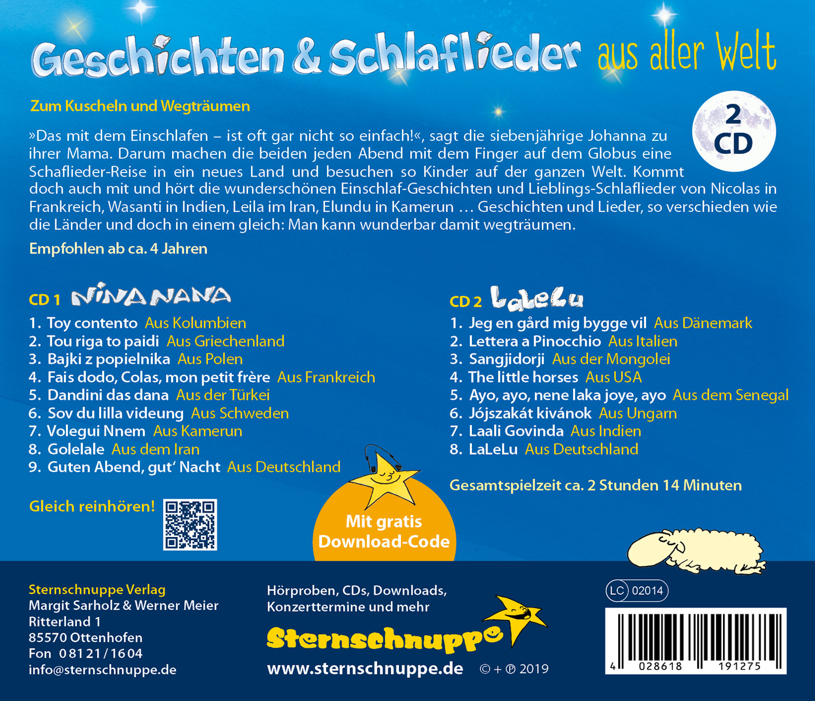 | Schlagworte | Einschlafen • Geschichten • Globus • guten Abend, gut' Nacht • Gute Nacht Geschichten • international • Kinderlieder • Kuscheln • Lalelu • Nina Nana • Schlaflied • Schlaflieder • Träumen • Traumreise • Welt • Weltreise |