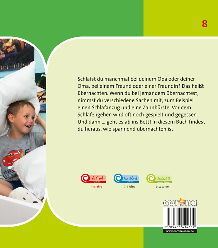 Schläfst du manchmal bei deinem Opa oder deiner Oma, bei einem Freund oder einer Freundin? Das heißt übernachten. Wenn du bei jemandem übernachtest, nimmst du verschiedene Sachen mit, zum Beispiel einen Schlafanzug und eine Zahnbürste. Vor dem Schlafengehen wird oft noch gespielt und gegessen. Und dann ... geht es ab ins Bett! In diesem Buch findest du heraus, wie spannend übernachten ist.