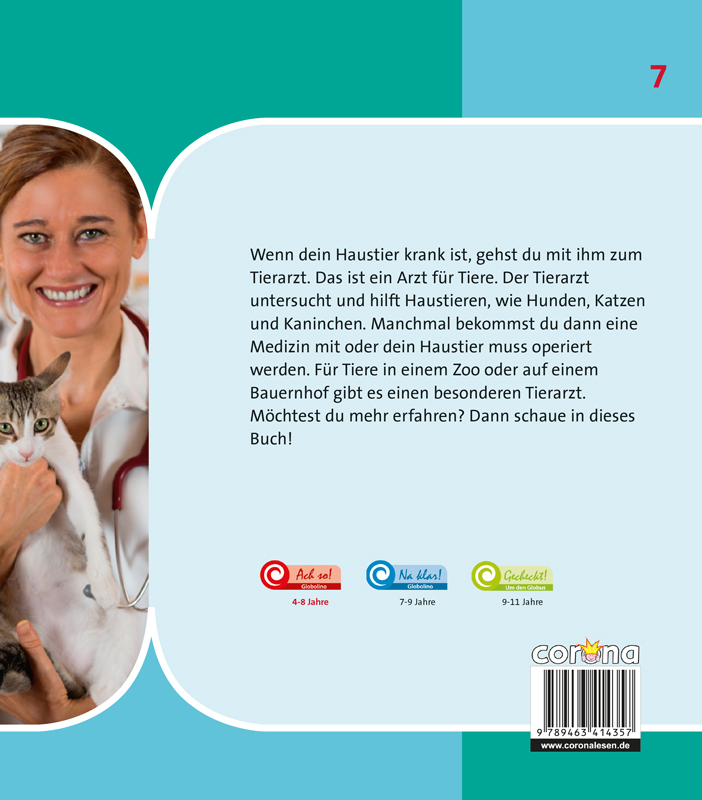 Wenn dein Haustier krank ist, gehst du mit ihm zum Tierarzt. Das ist ein Arzt für Tiere. Der Tierarzt untersucht und hilft Haustieren, wie Hunden, Katzen und Kaninchen. Manchmal bekommst du dann eine Medizin mit oder dein Haustier muss operiert werden. Für Tiere in einem Zoo oder auf einem Bauernhof gibt es einen besonderen Tierarzt. Möchtest du mehr erfahren? Dann schaue in dieses Buch!