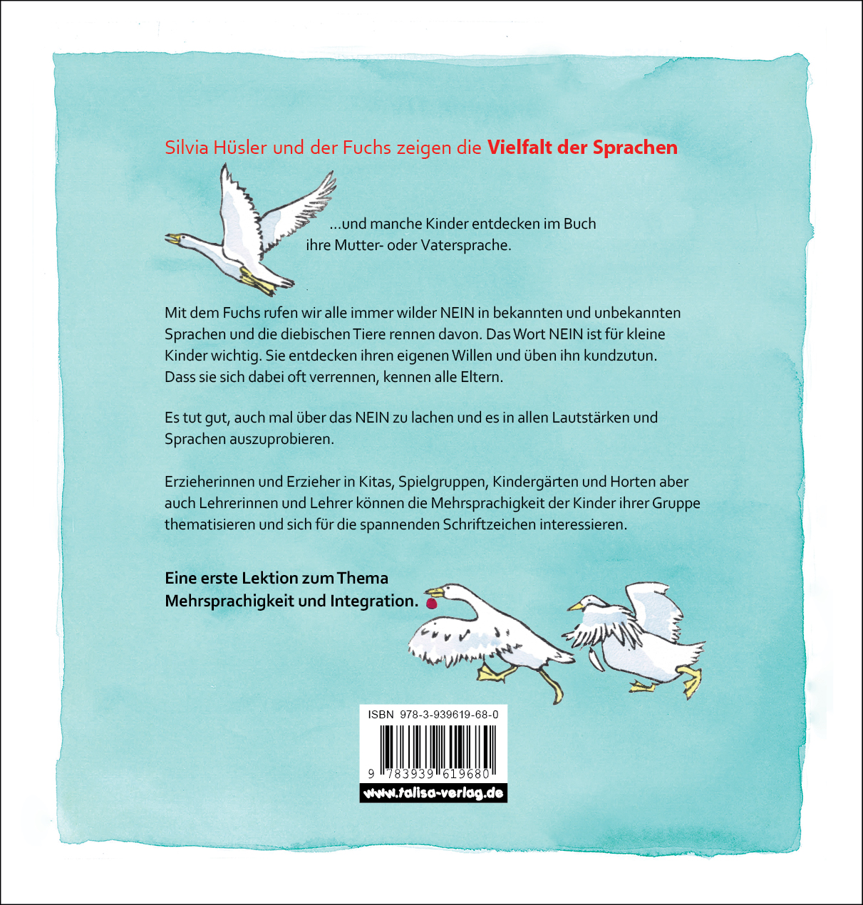 Silvia Hüsler und der Fuchs zeigen die Vielfalt der Sprachen... und manche Kinder entdecken im Buch ihre Mutter- oder Vatersprache. Mit dem Fuchs rufen wir alle immer wilder NEIN in bekannten und unbekannten Sprachen und die diebischen Tiere rennen davon. Das Wort NEIN ist für kleine Kinder wichtig. Sie entdecken ihren eigenen Willen und üben ihn kundzutun. Dass sie sich dabei oft verrennen, kennen alle Eltern. Es tut gut, auch mal über das NEIN zu lachen und es in allen Lautstärken und Sprachen auszuprobieren. Erzieherinnen und Erzieher in Kitas, Spielgruppen, Kindergärten und Horten aber auch Lehrerinnen und Lehrer können die Mehrsprachigkeit der Kinder ihrer Gruppe thematisieren und sich für die spannenden Schriftzeichen interessieren. Eine erste Lektion zum Thema Mehrsprachigkeit und Integration.