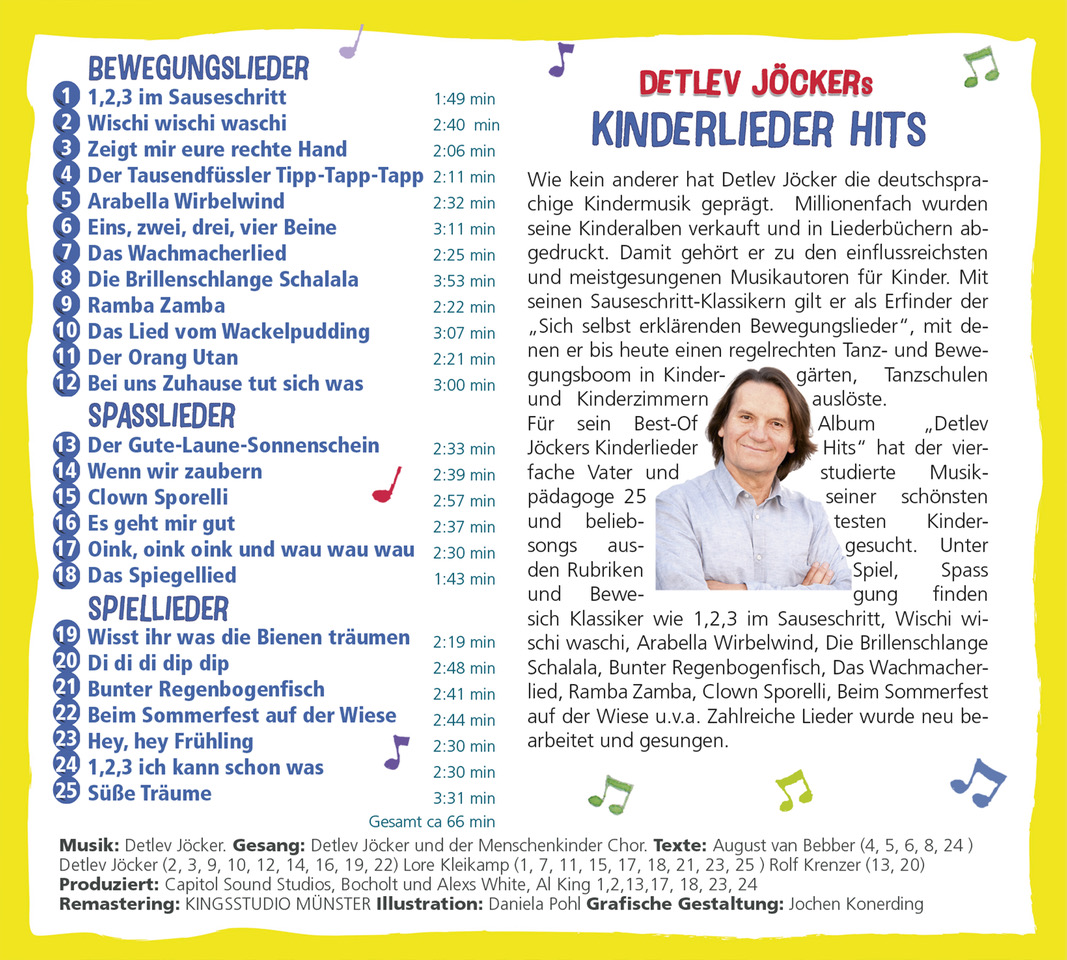 Für dieses Best-Of Album „Detlev Jöckers Kinderlieder Hits" hat der vierfache Vater und studierte Musikpädagoge 25 seiner schönsten und beliebtesten Kindersongs ausgesucht. Unter den Rubriken Spiel, Spass und Bewegung finden sich Klassiker wie 1,2,3 im Sauseschritt, Wischi wischi waschi, Arabella Wirbelwind, Die Brillenschlange Schalala, Bunter Regenbogenfisch, Das Wachmacherlied, Ramba Zamba, Clown Sporelli, Beim Sommerfest auf der Wiese u.v.a.