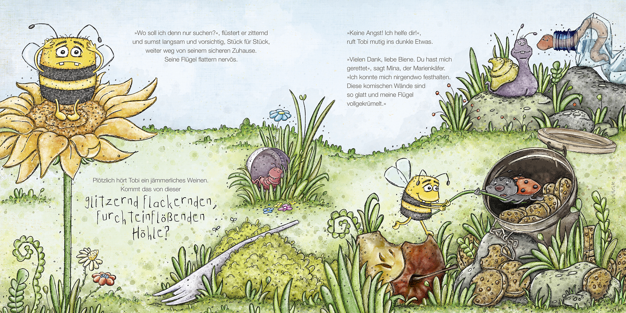 Tobi ist die ängstlichste Biene der Welt und möchte sein sicheres Bienenzuhause nie, nie, nie verlassen. Als jedoch sein allerbester Ameisenfreund Eloy von einem Ausflug nicht zurückkommt, macht sich Tobi große Sorgen. Die Angst, dass er seinen Freund nie mehr wiedersieht, ist größer als die Angst, nach draußen zu gehen, um nach Eloy zu suchen. Überwältigt von den vielen »SeltsamKomischDingen« und Düften im Wald, gewinnt er mit jedem Flügelschlag nicht nur Mut, sondern auch neue Freunde dazu.