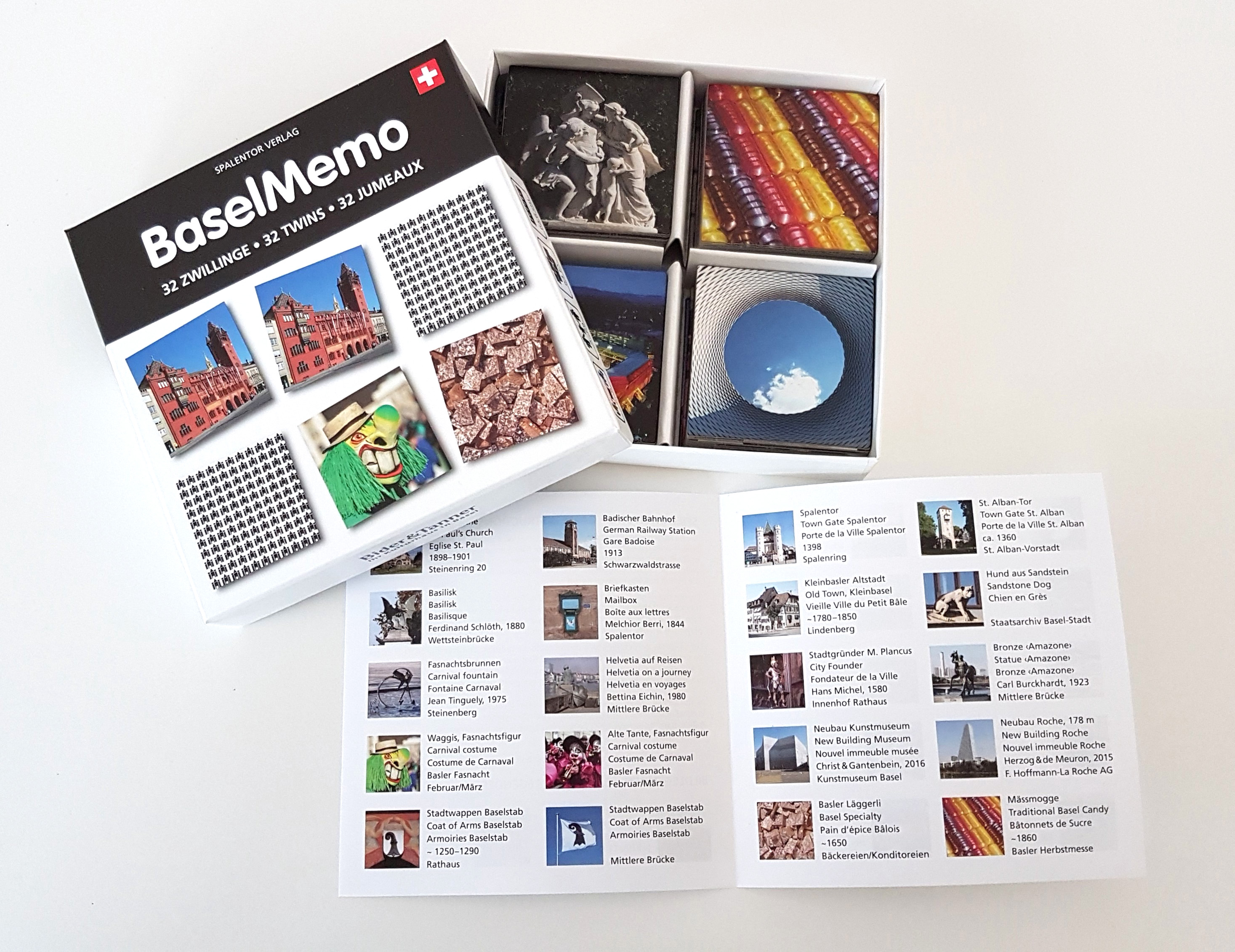 BaselMemo: Klassisches Memospiel mit Fotos von Basler Sehenswürdigkeiten und Stadtansichten, 2 x 32 Kärtchen. Beiliegend Infoblatt mit Details zu den einzelnen Fotografien: Beschrieb des Baus/des Ortes in d, f und e, Entstehungszeit, Standort