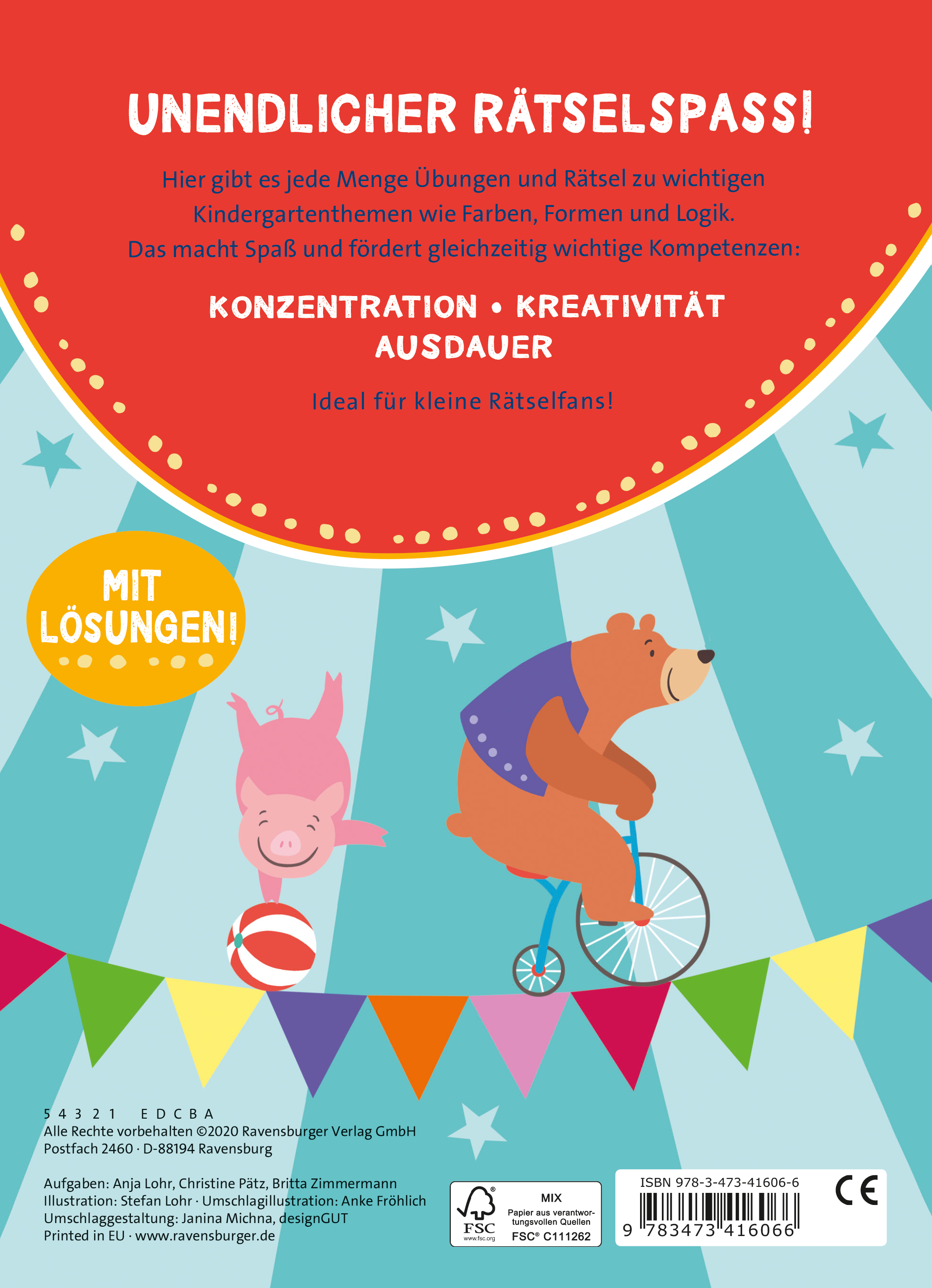 Kinder ab 4 Jahren finden in diesem extradicken Block jede Menge Rätsel, Suchbilder, Labyrinthe und Puzzles. So werden Grundlagen zu Farben, Formen und Logik spielerisch vermittelt. Die lustigen Illustrationen laden im Anschluss zum Ausmalen ein.