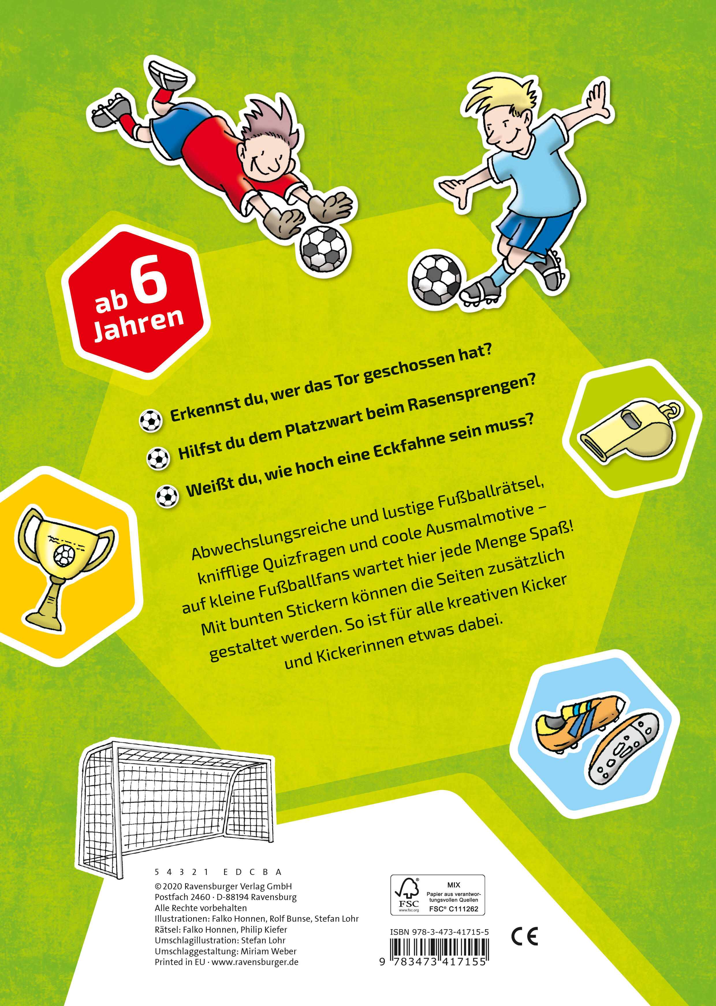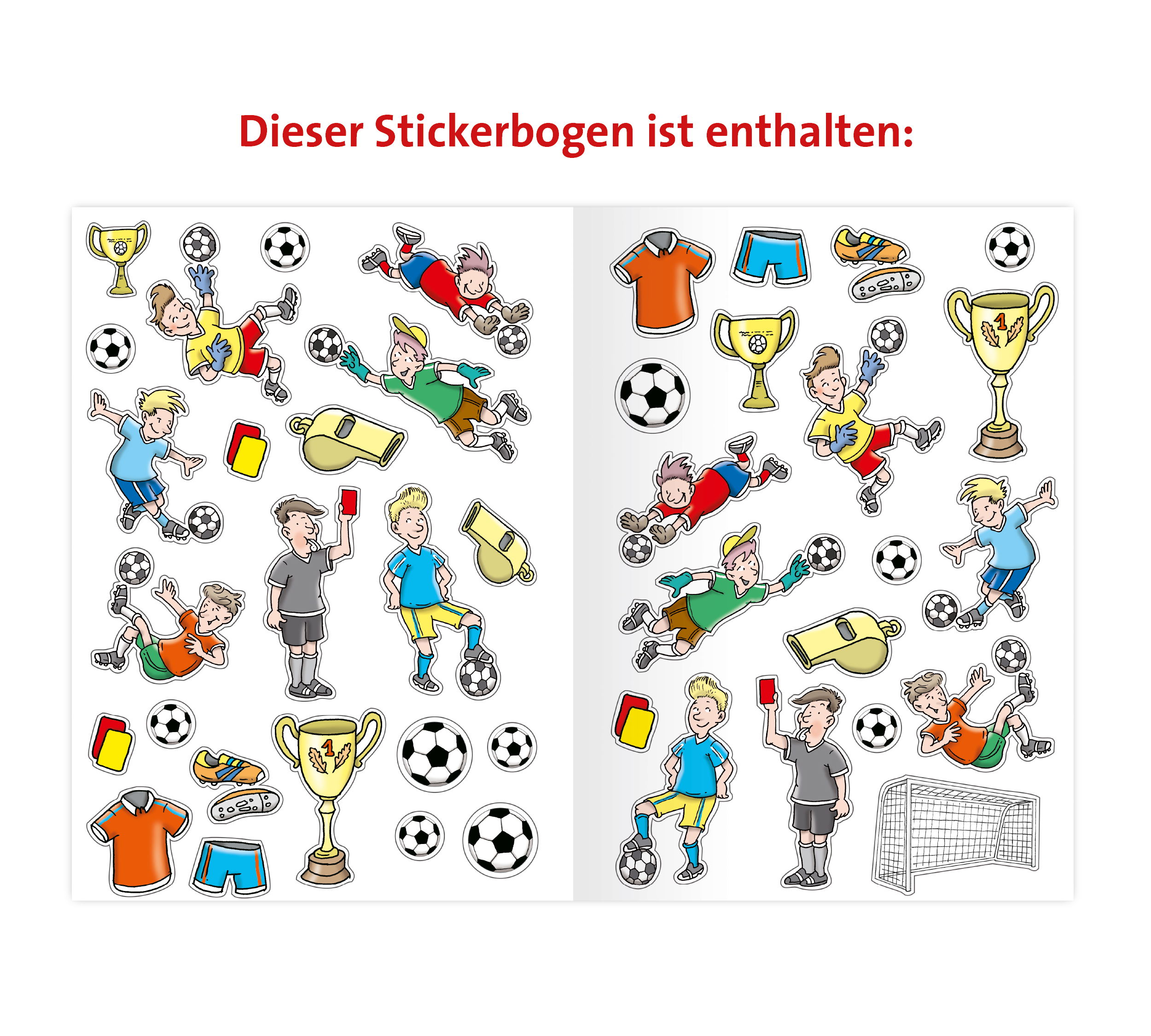 In diesem Buch wartet auf kleine Fußballfans jede Menge Mal- und Rätselspaß. Die farbigen Sticker sind universell einsetzbar und können zur freien Gestaltung der Ausmalbilder verwendet werden oder auch zur Verschönerung von Brotbox, Schulheft und Co!