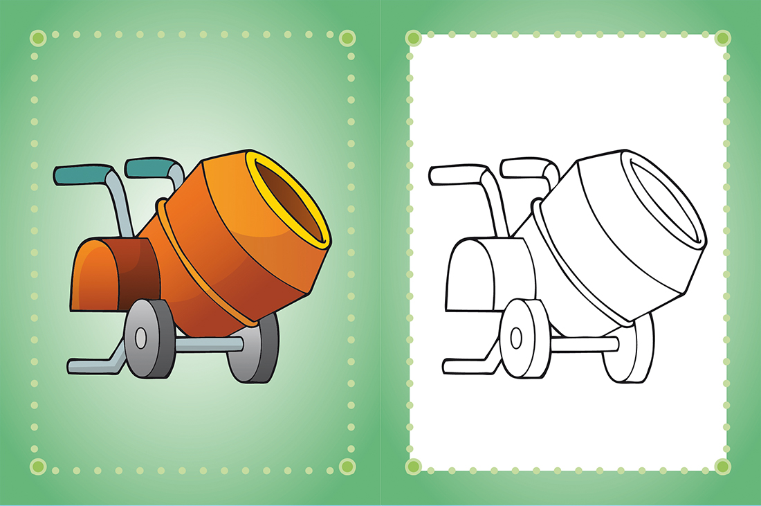 In diesem Malbuch findest du viele tolle Baustellen-Motive. Deine fertigen Bilder kannst du gerne auch mit Hilfe der farbigen Vorlagen kreativ ausmalen und in deinem Zimmer aufhängen.