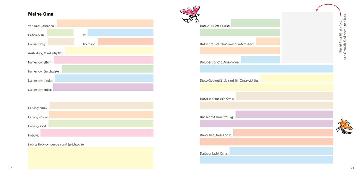 Die Bildergeschichte von Karla und ihrer Oma Luise erklärt Kindern in leicht verständlichen Worten die Krankheit Demenz. Zudem animieren Fragen, die direkt an die Kinder gestellt werden, zum Gespräch und interaktiven Vorlesen. Der anschließende Fachteil gibt Hintergrundinformationen zum Krankheitsbild und beantwortet u. a. die Fragen: Wie fühlen sich Menschen mit Demenz und wie kann man sie unterstützen? Wie nehmen Kinder die Veränderungen an ihrem Großelternteil wahr? Mit Tipps zur Unterstützung der kleinen Familienmitglieder und Ausfüllseiten zu Omas bzw. Opas Leben für die Biografiearbeit.