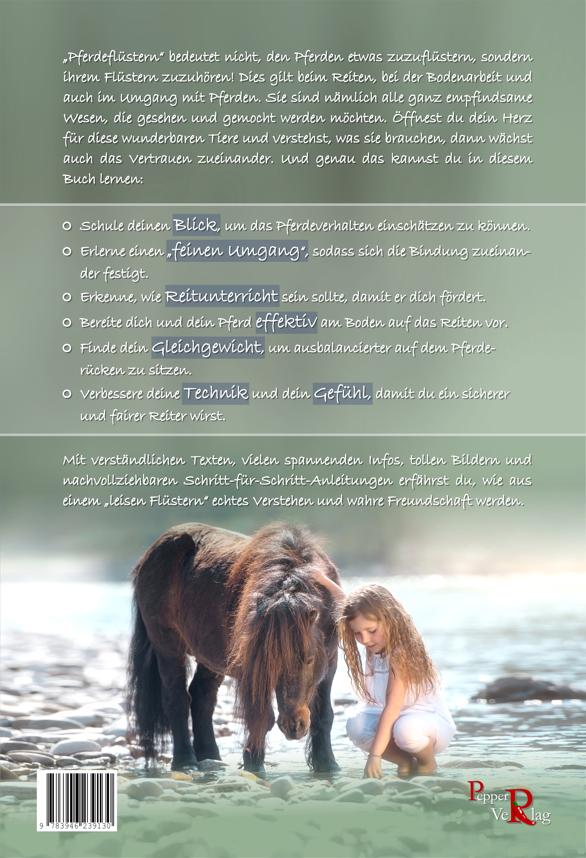 "Pferdeflüstern" bedeutet nicht, den Pferden etwas zuzuflüstern, sondern ihrem Flüstern zuzuhören! Dies gilt beim Reiten, bei der Bodenarbeit und auch im Umgang mit Pferden. Sie sind nämlich alle ganz empfindsame Wesen, die gesehen und gemocht werden möchten. Öffnest du dein Herz für diese wunderbaren Tiere und verstehst, was sie brauchen, dann wächst auch das Vertrauen zueinander. Und genau das kannst du in diesem Buch lernen:-Schule deinen Blick, um das Pferdeverhalten einschätzen zu können. -Erlerne einen "feinen Umgang", sodass sich die Bindung zueinander festigt.-Erkenne, wie Reitunterricht sein sollte, damit er dich fördert. -Bereite dich und dein Pferd effektiv am Boden auf das Reiten vor. -Finde dein Gleichgewicht, um ausbalancierter auf dem Pferderücken zu sitzen.-Verbessere deine Technik und dein Gefühl, damit du ein sicherer und fairer Reiter wirst.Mit verständlichen Texten, vielen spannenden Infos, tollen Bildern und nachvollziehbaren Schritt-für-Schritt-Anleitungen erfährst du, wie aus einem "leisen Flüstern" echtes Verstehen und wahre Freundschaft werden.