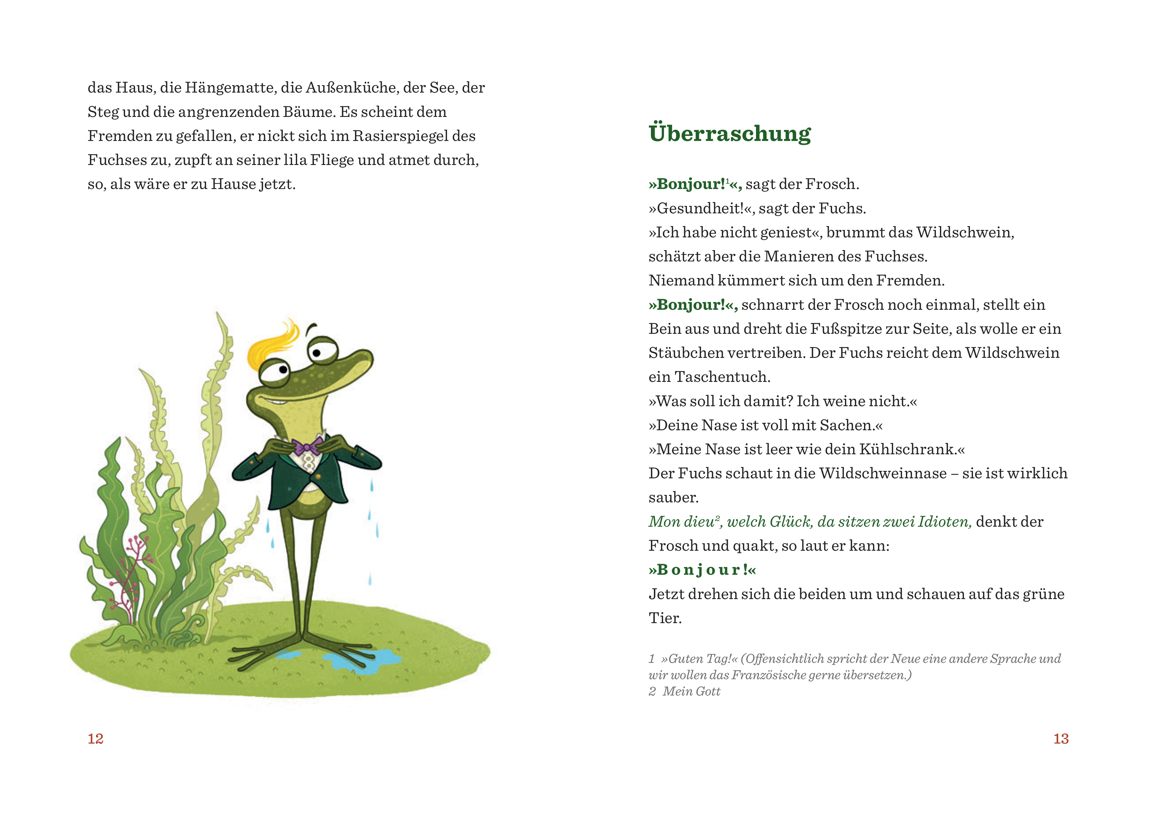 Frosch oder König, das ist hier die Frage! Eigentlich haben Fuchs und Wildschwein die kleine Eintagsfliege erwartet, aber was steigt da jetzt aus dem Wasser? Ein Frosch, der auch noch behauptet, ein König zu sein - um genau zu sein, ihr König. Und König Frosch verlangt ein Schloss, frisch gegrillte Fliegen und absoluten Gehorsam. Er lässt die beiden sogar eine Mauer errichten, um den Storch fernzuhalten, der angeblich ein böser Zauberer ist. Werden die zwei besten Freunde, die der Wald je gesehen hat, diesem selbstgekrönten König auf den Leim gehen? Nach seinem erfolgreichen Kinderbuch "Nur ein Tag" ist Martin Baltscheit hier ein weiteres Meisterwerk mit Wildschwein und Fuchs gelungen, in dem Populismus, Lügenherrschaft und Manipulation mit Charme, Witz und Tiefgang fröhlich aufgespießt werden. Große Philosophie für kleine Leser, warmherzig illustriert von SaBine Büchner.