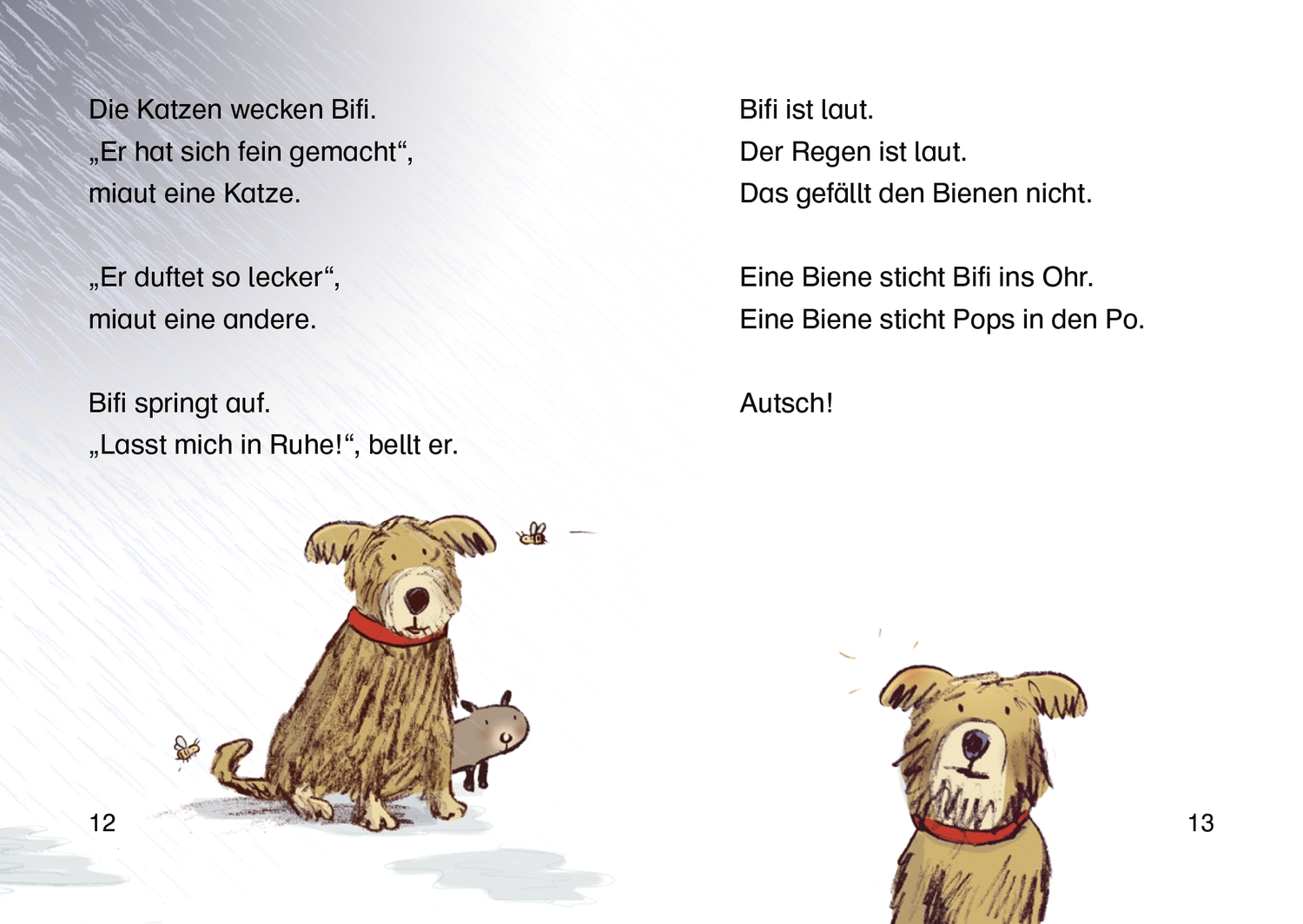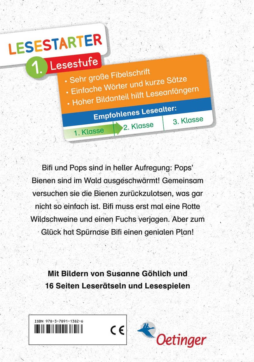 Bifi und Pops ermuntern zum bienenfleißigen Lesen Auf seinem Motorrad und mit Bifi im Beiwagen fährt Hobby-Imker Pops in den Wald, um nach seinen Bienenkästen zu sehen. Bifi verjagt erstmal eine Rotte Wildschweine und einen Fuchs, wovon Pops nicht einmal etwas mitbekommt. Doch als ein Bienenvolk samt Königin ausschwärmt, ist auch Pops in heller Aufregung. Gemeinsam versuchen sie die Bienen zurückzulotsen, was gar nicht so einfach ist. Aber zum Glück hat Spürnase Bifi einen Plan!