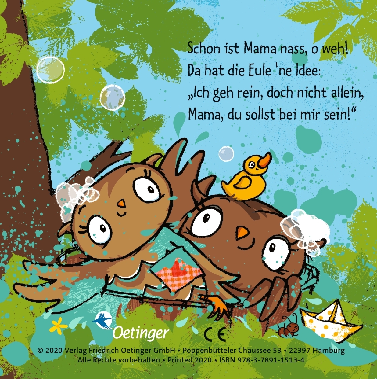 Die Eule im beliebten Badebuch-Format Heute ist Badetag bei der kleinen Eule. Darüber ist die kleine Eule jedoch gar nicht glücklich. Wasser ist ihr viel zu nass! Mama lockt mit extra viel Badeschaum und einer Quietsche-Ente, aber auch das überzeugt die kleine Eule nicht. Da fängt Mama an, mit Wasser zu spritzen, und ruckzuck sind beide Eulen nass. Da hat die kleine Eule eine Idee: Mama soll mit in die Wanne! Und zusammen macht Baden gleich viel mehr Spaß!