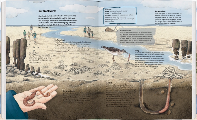 Ein endlos weiter Horizont, der Rhythmus rauschender Wellen, eine frische Brise und der salzige Meeresgeruch - das Wattenmeer der Nordsee ist nicht umsonst ein Weltnaturerbe der UNESCO. Über und unter Wasser, am Spülsaum, in den Dünen und in der Luft: Überall wimmelt es von einzigartigen Lebewesen. Dieses lebendige und naturnah illustrierte Sachbilderbuch macht uns mit ganz unterschiedlichen Wattbewohnern bekannt und zeigt sie in ihrem jeweiligen Lebensraum: die winzige Nordseegarnele, die pfeilschnelle Küstenseeschwalbe, den wendigen Seehund und zahlreiche andere faszinierende Tiere. Viele von ihnen kann man bei einem Spaziergang am Strand oder im Watt entdecken. Wie und wo? Auch das erfahren wir in diesem Buch!