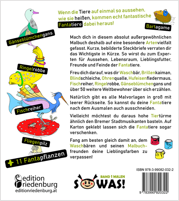 | Zusatzinfo | Kreative Ausmal-Vorlagen von über 50 fantastischen Tieren (Fantatiere) und 11 fantastischen Pflanzen (Fantapflanzen). |