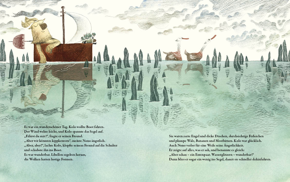 Den Trollgnomfrosch gibt es nicht, behauptet Kolo. Aber sein Freund Nono lässt sich nicht überzeugen. Wo doch der Trollgnomfrosch die schrecklichsten Ohren der Welt hat und das gnomigste Gnomgesicht! Das weiß Nono ganz genau! Solange der Frosch unter dem Stein hockt, wagt sich Nono sicher nicht zum Bootsausflug auf den See hinaus ... Am Ende helfen liebevolle Zuwendung, die Natur und die Kraft der Phantasie. Trost und Entspannung für kleine Angsthasen, in lyrisch-rhythmischer Sprache. Zart, liebevoll, verträumt und sprachverspielt - eine hübsche, lustige Geschichte mit starkem Thema.