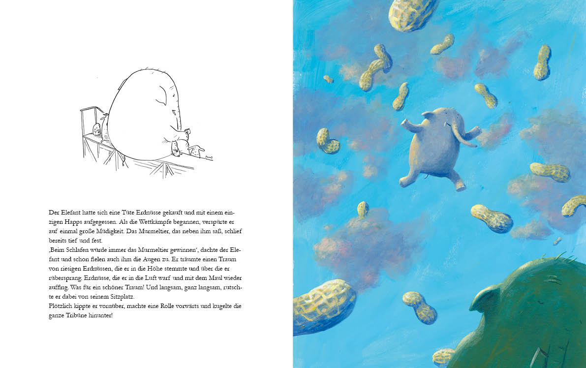 Immer gewinnen dieselben Tiere - das ist so langweilig, dass das Publikum einnickt und von den Rängen purzelt. Als auch der Elefant purzelt, ist klar, dass sich etwas ändern muss! Da hat die Zwergmaus eine Idee: Ab jetzt sollen diejenigen die Sieger sein, die als Letzte ins Ziel gehen, das geringste Gewicht stemmen und am wenigsten weit springen können. Ganz schön tricky! Aber alle Tiere wollen es versuchen (bis auf die üblichen Sieger natürlich). Es entspinnt sich eine haarsträubend schräge Olympiade der neuen Art. Eine wunderbar turbulente, sehr lustige neue Vorlesegeschichte von Jens Rassmus, mit Witz und Verve erzählt und in Bilder gesetzt.
