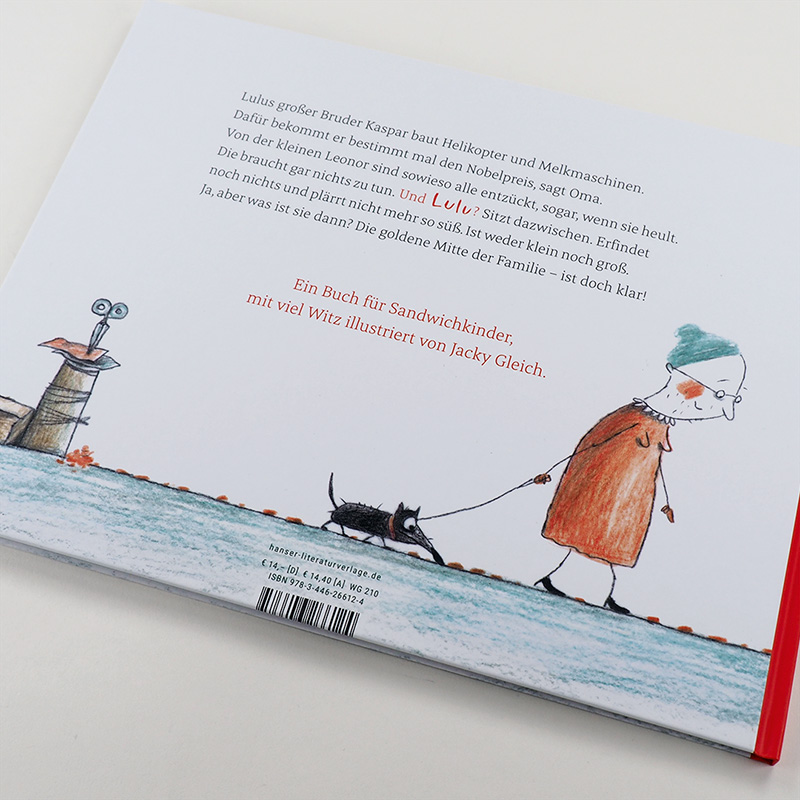 Ein charmantes Buch für alle Sandwichkinder, mit viel Witz illustriert von Jacky Gleich. Lulu ist das mittlere Kind. Lulus großer Bruder Kaspar baut Helikopter und Melkmaschinen. Er ist ein toller Erfinder. Dafür bekommt er bestimmt mal den Nobelpreis, sagt Oma. Und von der kleinen Leo sind immer alle entzückt, ganz egal, was sie macht. Kaum weint sie, nimmt Mama sie auf den Arm und tröstet sie. Und Lulu? Will den Tisch decken, aber das hat schon Papa gemacht. Will beim Kochen helfen, aber da steht das Essen schon auf dem Tisch. Lulu reicht's: Sie ist nicht klein, aber auch noch nicht groß. Was ist sie denn dann? Die goldene Mitte der Familie - ist doch klar!