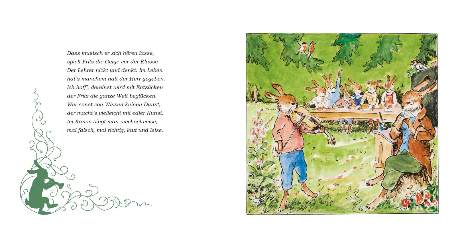 Der kleine Hasenfritz ist nicht nur ein guter Schüler, sondern auch ein richtiger Musikant. Egal, ob er im Unterricht Geige spielt, mit den Meisen um die Wette flötet oder das Posthorn bläst - das bereitet allen Freude und lässt die Welt auch gleich ein wenig heller werden ...