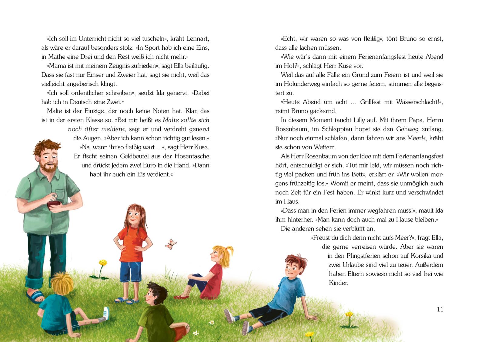 Ida, Lennart, Malte, Ella und Bruno können es kaum erwarten. Endlich Sommerferien! Das Beste daran ist natürlich das Verreisen. Aber dann kommt Papa Rosenbaums Hexenschuss dazwischen. Stattdessen sollen Ida, Lennart und Lilly die Ferien bei Oma und Opa verbringen. Aber nur, wenn ihre Freunde aus dem Holunderweg auch mitkommen dürfen!, da sind sie sich einig. Wer hätte gedacht, dass es da sogar noch spannender ist als in Italien: Sie dürfen alle zusammen im alten Schäferwagen hinter dem Haus übernachten und es warten jede Menge Überraschungen auf sie!