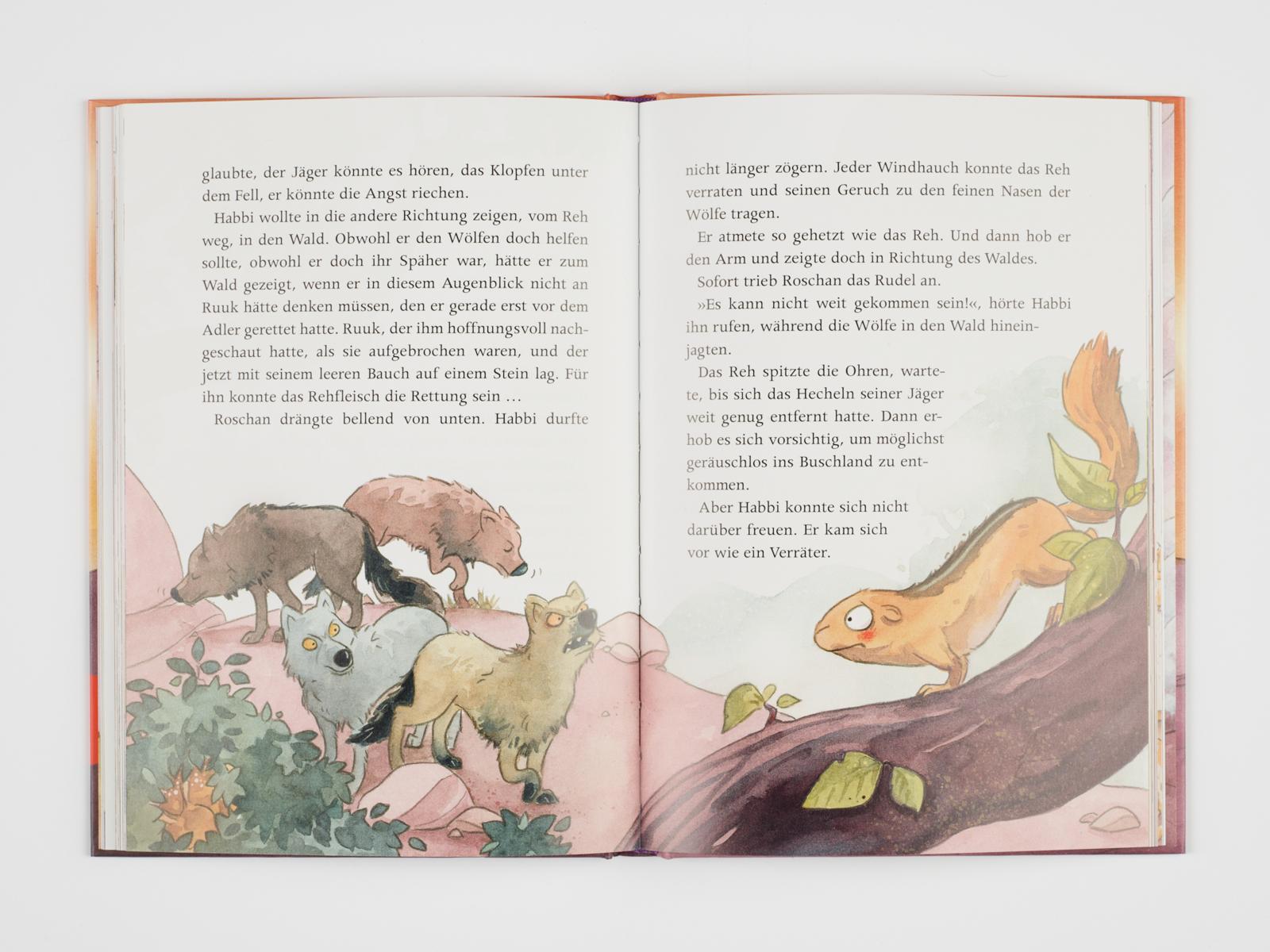 Übermütig jagen Habbi und Yaruk durch die weite Ebene. Einen ganzen Winter haben sie sich nicht gesehen! Als die Sonne untergeht, muss Habbi zurück zu seiner Erdhörnchenfamilie. Doch der Fluss, der sich am Morgen problemlos überqueren ließ, hat sich in einen reißenden Strom verwandelt. Habbi bleibt nichts anderes übrig, als bei Yaruks Rudel Unterschlupf zu suchen. Mit mulmigem Gefühl folgt er seinem Freund ins Wolfstal ...