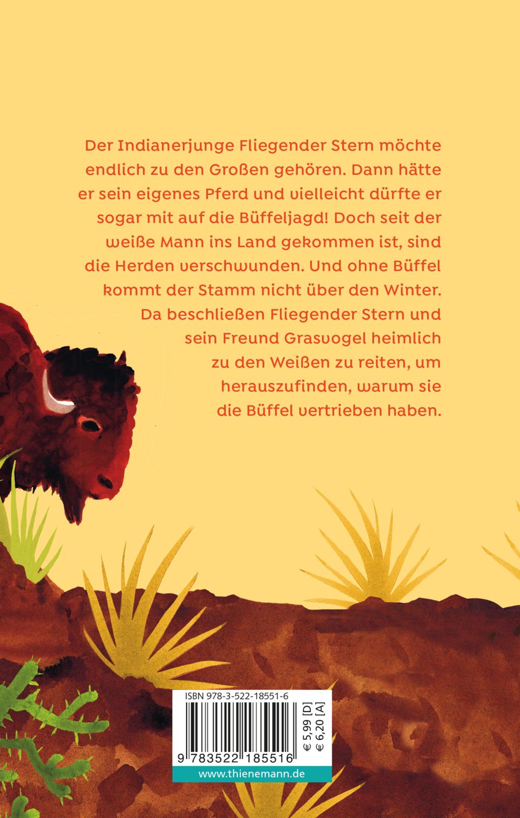 Der Indianerjunge Fliegender Stern möchte endlich zu den Großen gehören. Dann hätte er sein eigenes Pferd und vielleicht dürfte er sogar mit auf die Büffeljagd! Doch seit der weiße Mann ins Land gekommen ist, sind die Herden verschwunden. Und ohne Büffel kommt der Stamm nicht über den Winter. Da beschließen Fliegender Stern und sein Freund Grasvogel heimlich zu den Weißen zu reiten, um herauszufinden, warum sie die Büffel vertrieben haben.