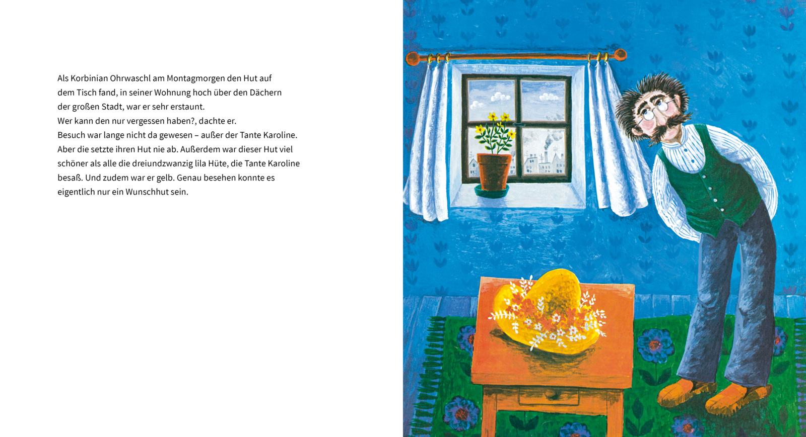 Korbinian findet eines Tages unverhofft einen Wunschhut. Und was macht man mit einem Wunschhut? Man wünscht sich was! Als Erstes wünscht sich Korbinian einen Apfelbaum in seine Wohnung, dann Strümpfe ohne Löcher und dann einen fliegenden Regenschirm. Seine Nachbarn finden Korbinians Wünsche idiotisch. Warum wünscht er sich nicht ein dickes Auto? Oder einen Swimming Pool? Doch Korbinian weiß, was ihn glücklich macht.