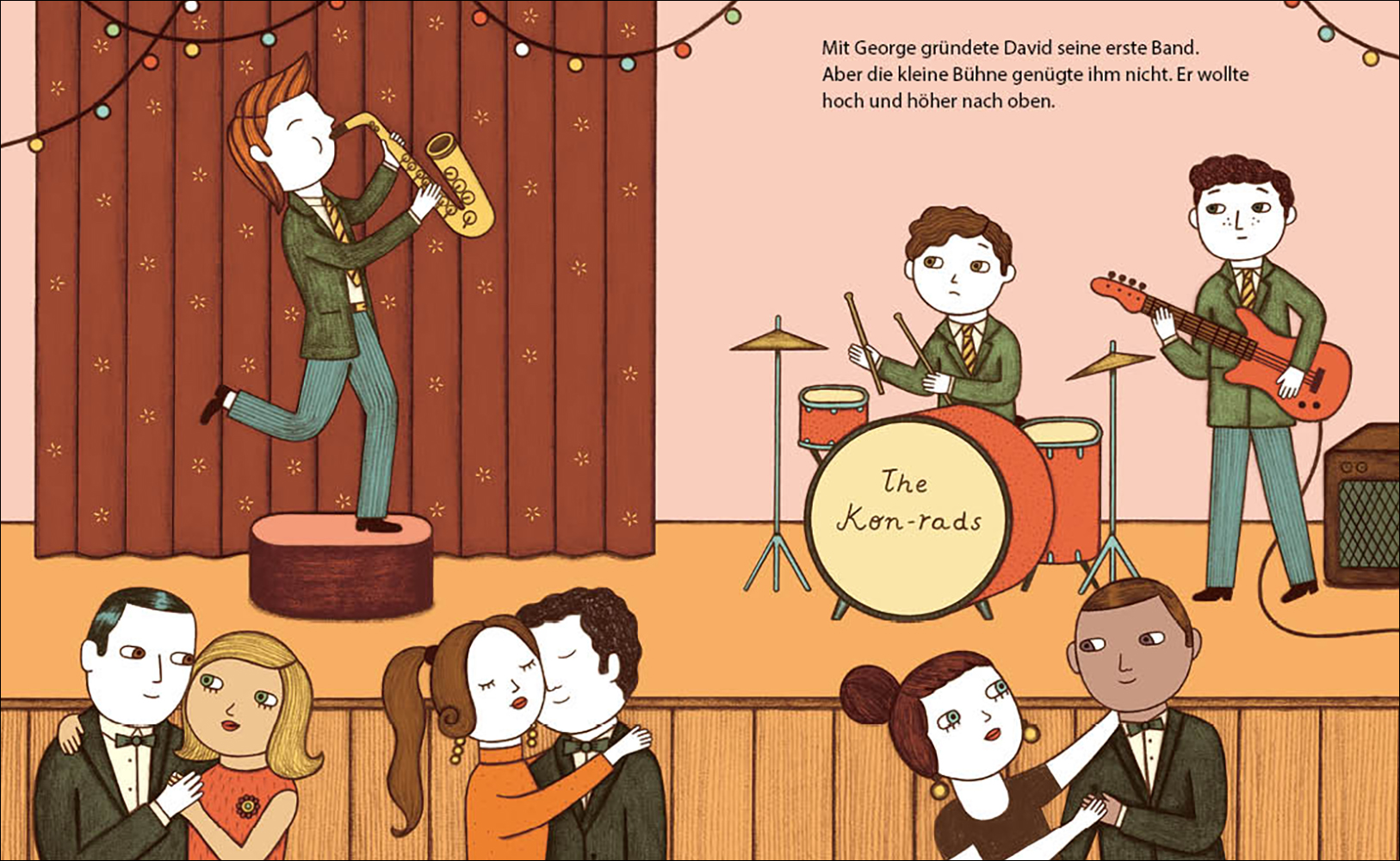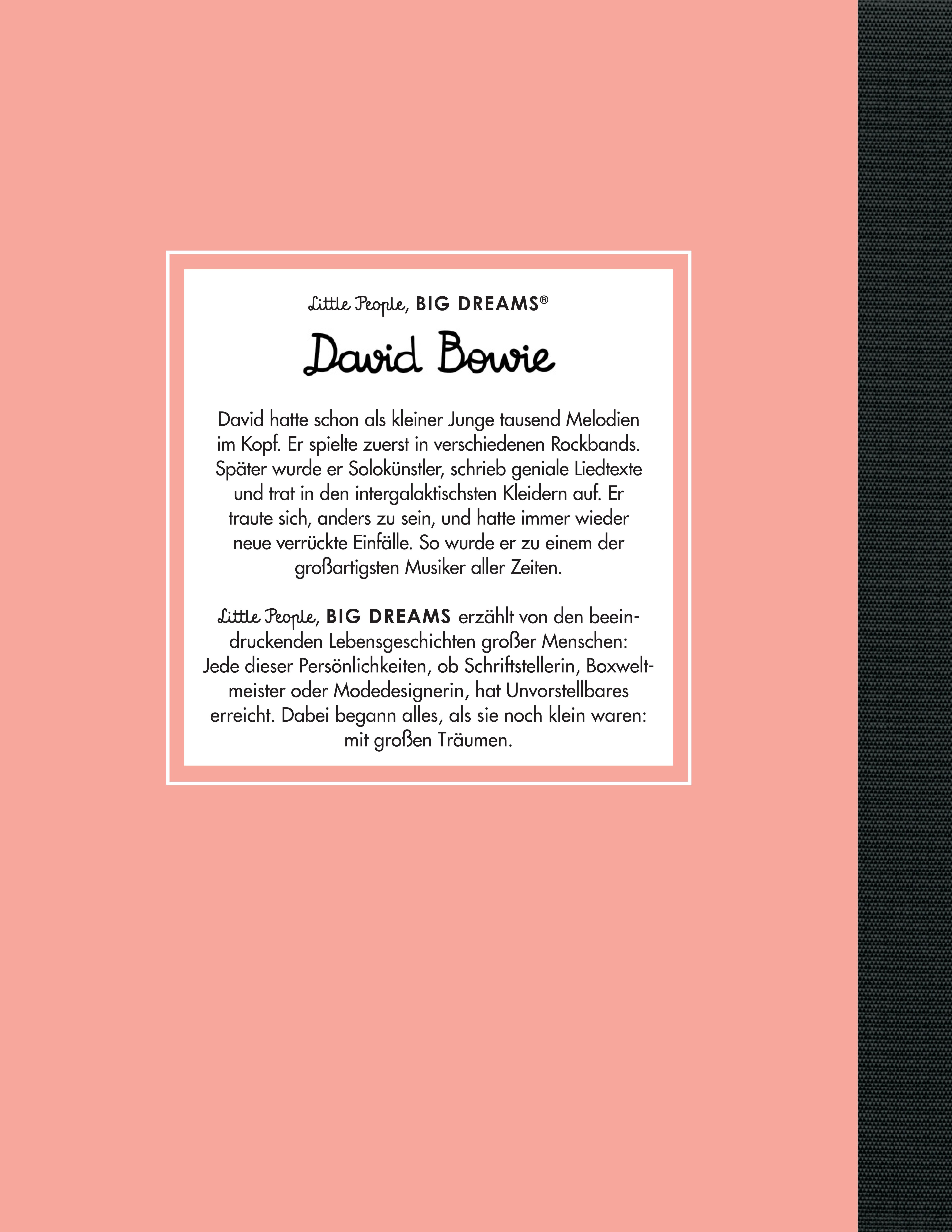 David hatte schon als kleiner Junge tausend Melodien im Kopf. Er spielte zuerst in verschiedenen Rockbands. Später wurde er Solokünstler, schrieb geniale Liedtexte und trat in den intergalaktischsten Kleidern auf. Er traute sich, anders zu sein, und hatte immer wieder neue verrückte Einfälle. Mit zahlreichen Hits wie Heroes, Life on Mars? und Sound and Vision sowie Musikalben wie The Rise and Fall of Ziggy Stardust and the Spiders from Mars und Hunky Dory hat er beeindruckenden Erfolg erzielt. So wurde er zu einem der großartigsten Musiker aller Zeiten.