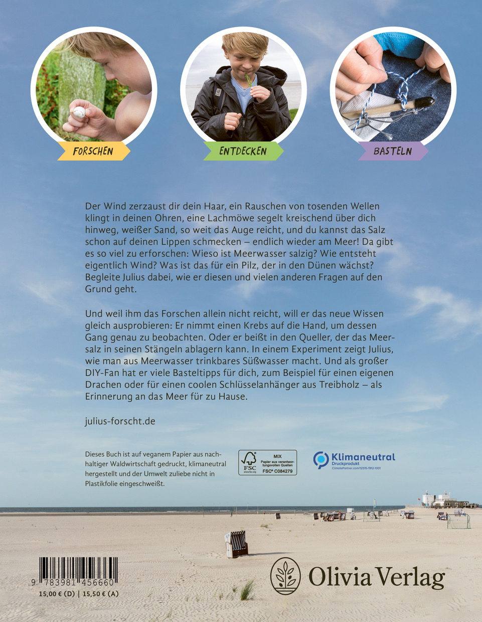 Wasser ist überall! Unsere Erde besteht zu über 70% aus Wasser - ebenso wie unser Körper selbst. Bei der Geburt sind es sogar 95%. Kinder lieben Wasser. Ein Sommerurlaub ohne Meer, See oder Pool ist für sie nur die Hälfte wert. Entsprechend hoch ist das Interesse von Kindern am Element Wasser: Wieso ist Meerwasser salzig? Wohin fließt das Wasser bei Ebbe ab? Wieso gehen Krebse seitlich? Diesen und anderen Fragen geht Julius in seinem Buch "Julius forscht - Am Meer" auf den Grund. Dabei erklärt er Sachverhalte, führt spannende Experimente durch, lädt zu Entdeckungen ein und gibt jede Menge Basteltipps.