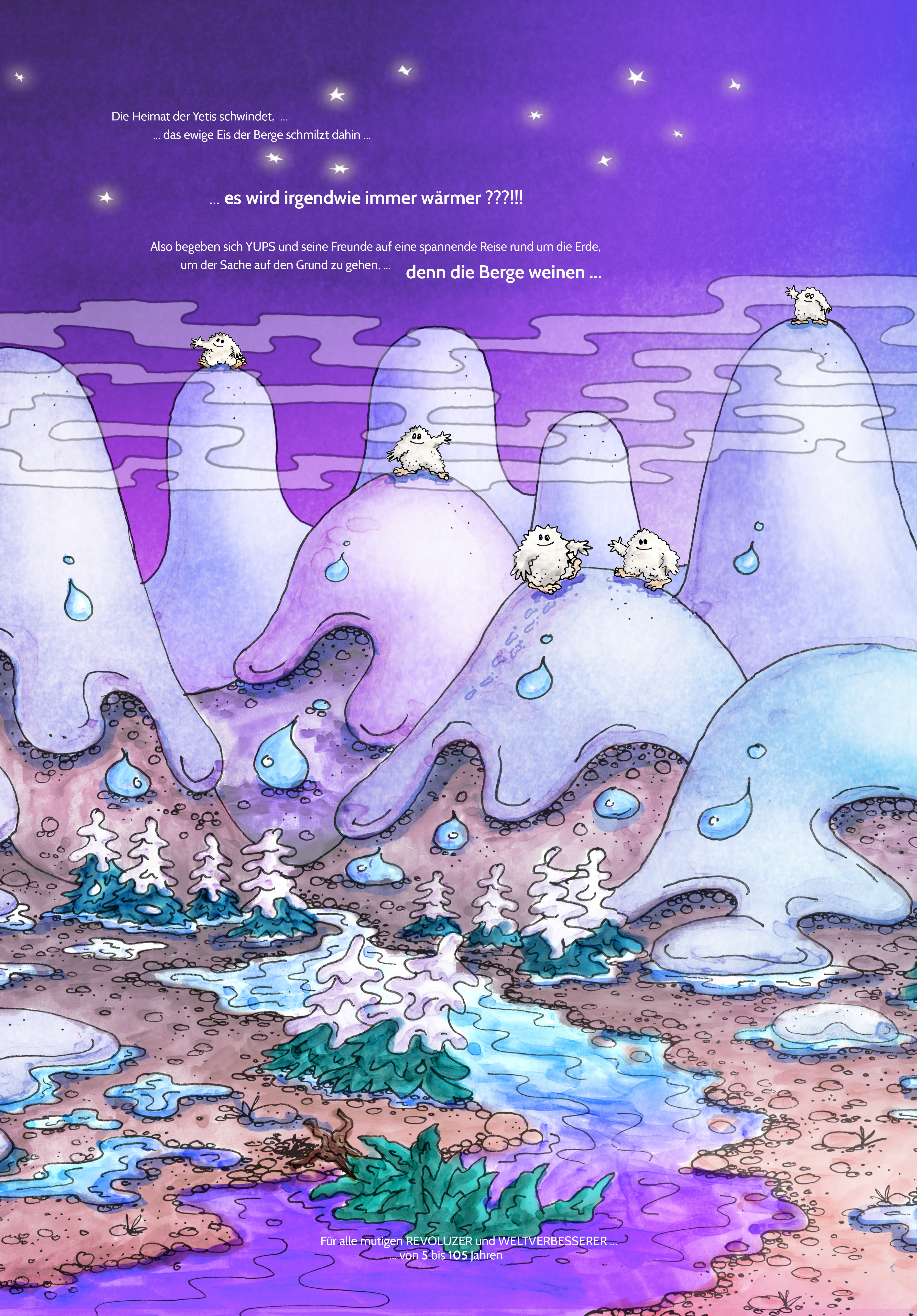 Die Heimat der Yetis schwindet, ... es wird irgendwie immer wärmer ? ... Also machen sich Yups, der Yeti und seine Freunde auf eine spannende Reise rund um die Erde, um der Sache auf den Grund zu gehen. - Denn die Berge weinen - In diesem Buch wird der große Zusammenhang eines unbequemen Themas leicht nachvollziehbar, nahezu komplett erläutert - der von Menschen gemachte Klimawandel. Ein nicht ganz so lustiges Thema, welches jedoch immer mehr unseren Alltag bestimmt, wird ganzheitlich in all seinen Facetten in aufwendigen Illustrationen erläutert.