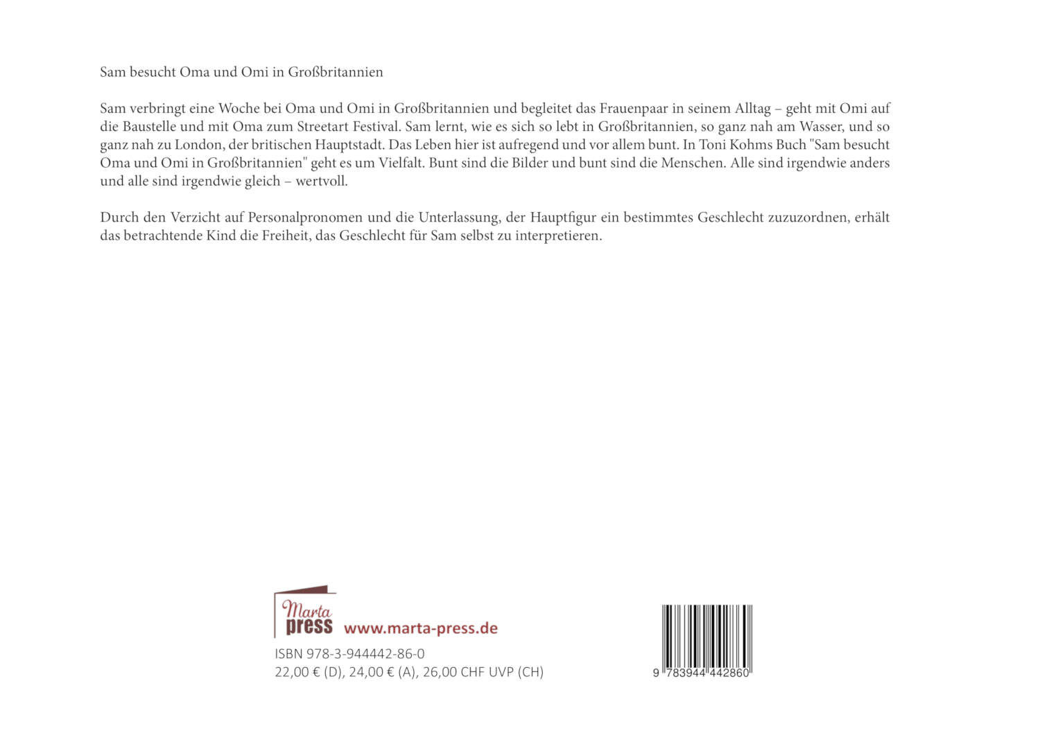 Sam verbringt eine Woche bei Oma und Omi in Großbritannien und begleitet das Frauenpaar in seinem Alltag - geht mit Omi auf die Baustelle und mit Oma zum Streetart Festival. Sam lernt, wie es sich so lebt in Großbritannien, so ganz nah am Wasser, und so ganz nah zu London, der britischen Hauptstadt. Das Leben hier ist aufregend und vor allem bunt. In Toni Kohms Buch "Sam besucht Oma und Omi in Großbritannien" geht es um Vielfalt. Bunt sind die Bilder, bunt die Menschen, ihre Identitäten, Ethnien, Kulturen. Alle sind irgendwie anders und alle sind irgendwie gleich - wertvoll.