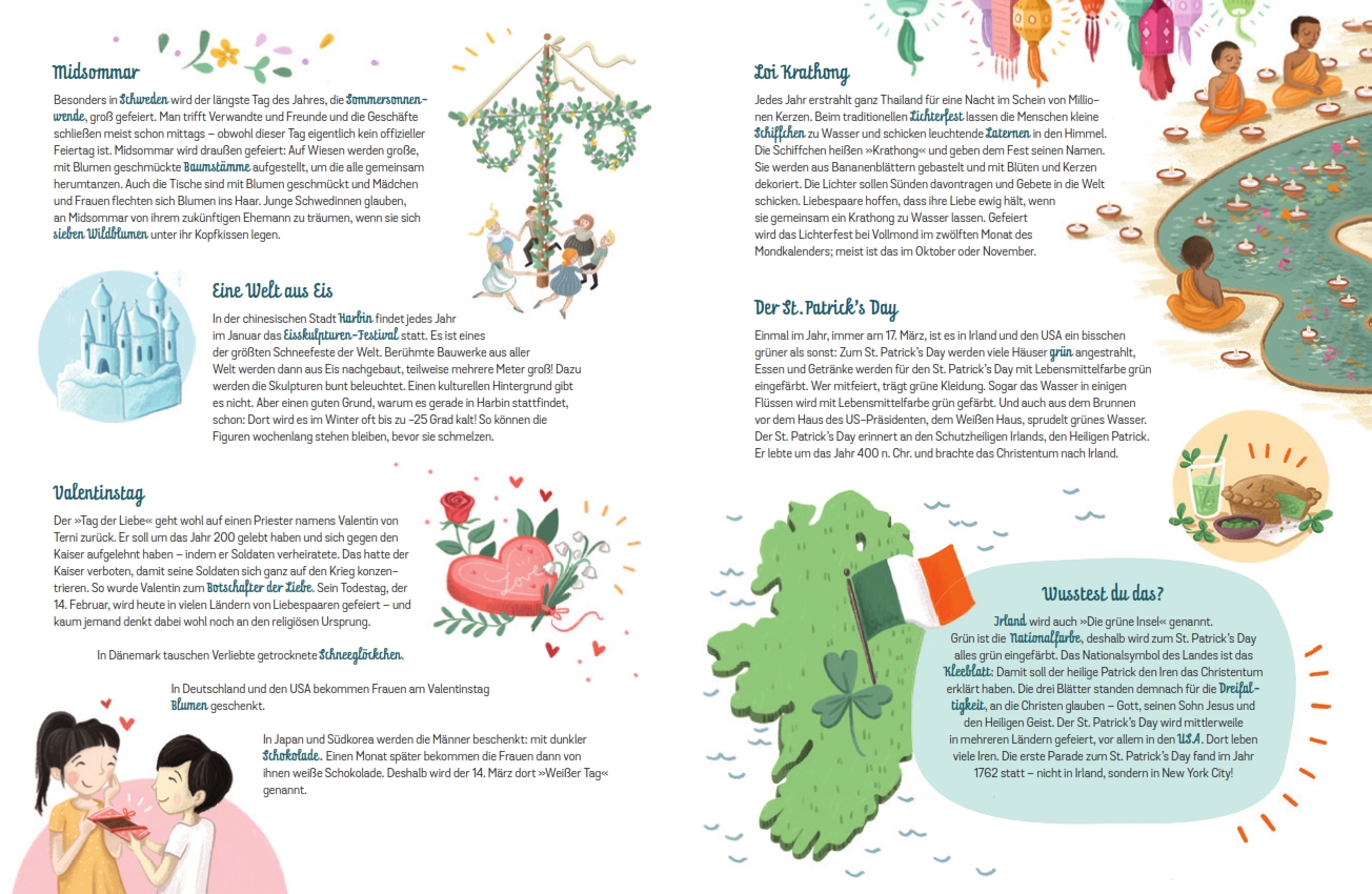 Wo bekommt das Geburtstagskind "Feenbrot"? Wann isst man in China lange Nudeln? Warum darf man in Schottland zu einer Hochzeit nichts Grünes tragen? Wer feiert das Zuckerfest? Wann und mit welchen Bräuchen wird das neue Jahr rund um die Welt begrüßt?