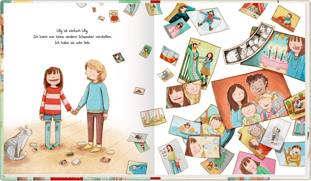 "Lilly kann nicht schnell laufen. Sie kann nicht auf Bäume klettern und auch noch nicht so gut sprechen. Aber Lilly lacht, wenn sie hoch bis zum Himmel schaukelt. Sie malt mit den Fingern wunderschöne bunte Bilder, und sie strahlt, wenn die Sonne scheint. Manchmal ist Lilly auch etwas langsam – aber ich lasse mir selbst gern Zeit. Und manchmal ist sie bockig – so wie ich. Lilly ist meine Schwester und ich habe sie lieb ..."