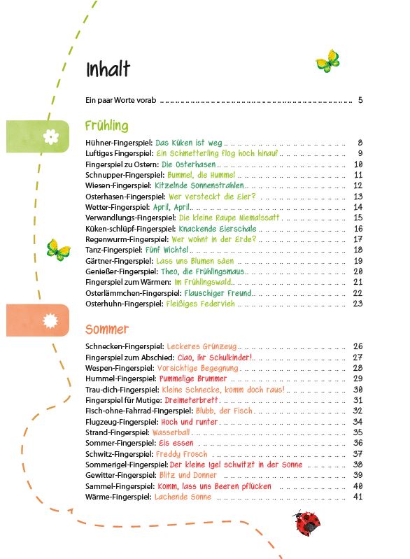 Ein Ausflug mit Frühlingsmaus Theo, ein Schwimmbadabenteuer im Sommer oder ein Besuch bei Herrn Schneemann in klirrender Kälte - bei den Fingerspielen in diesem Buch reisen die Kinder mit den Händen durch das ganze Jahr. Zur Begrüßung im Morgenkreis, als Zeitverkürzer oder einfach zwischendurch: für jede Jahreszeit ist die passende Idee schnell zur Hand und einfach umgesetzt.